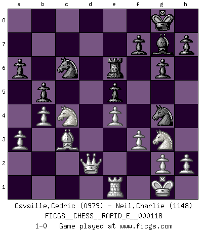 Last move : 1-0 2013 November 25 20:20:2 [Event "FICGS__CHESS__RAPID_E__000118"] [Site "FICGS"] [Date "2013.11.05"] [Round "1"] [White "Cavaille,Cedric"] [Black "Neil,Charlie"] [Result "1-0"] [WhiteElo "0979"] [BlackElo "1148"] 1.d4 d5 2.Nc3 Nf6 3.Nf3 e6 4.e3 Bb4 5.Bd2 c5 6.dxc5 Bxc5 7.Bd3 O-O 8.O-O Nc6 9.a3 e5 10.b4 Bd6 11.e4 d4 12.Ne2 Bd7 13.c4 dxc3 14.Bxc3 Bg4 15.Nh4 Be6 16.Ng3 Re8 17.Qf3 Bf8 18.Rad1 a6 19.Qe2 Qc7 20.Bc4 b5 21.Bxe6 Rxe6 22.Qb2 Rd8 23.Rxd8 Qxd8 24.Nhf5 Qd3 25.Re1 Qc4 26.Qd2 g6 27.Ne3 Bg7 28.Nxc4 Ng4 29.f3 1-0 Queen's pawn : Chigorin variation Kingside Castling by player Black (move 7) Kingside Castling by player White (move 8) Player White won this chess game. Follow this game move after move (download)In blitz, the Knight is stronger than the Bishop. (Vlastimil Hort) Korrekt heißt in Deutschland die Haltung eines Mannes, dessen Benehmen nach dem Urteile seiner Nachbarn seiner Stellung angemessen ist. Um korrekt zu sein, muß man sich der Meinung der anderen anpassen... (Emanuel Lasker) El Ajedrez detiene a su maestro dentro de sus propios vínculos, encadenando la mente y el cerebro, por lo que la libertad interior del mas fuerte debe sufrir. (Albert Einstein) Il s'avisa de me proposer d'apprendre les échecs qu'il jouait un peu... me voilà forcené des échecs. J'achète un échiquier, je m'enferme dans ma chambre, j'y passe des jours et des nuits à vouloir apprendre par cur toutes les parties. (Jean-Jacques Rousseau, Confessions) Whoever said the pen is mightier than the sword obviously never encountered automatic weapons. (US General Douglas MacArthur)