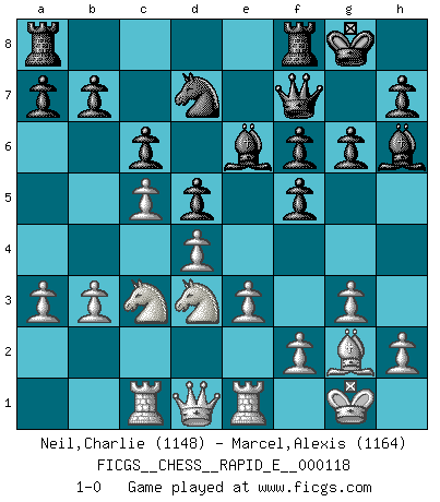 Last move : 1-0 2013 December 29 10:10:42 [Event "FICGS__CHESS__RAPID_E__000118"] [Site "FICGS"] [Date "2013.11.05"] [Round "1"] [White "Neil,Charlie"] [Black "Marcel,Alexis"] [Result "1-0"] [WhiteElo "1148"] [BlackElo "1164"] 1.d4 f5 2.Bg5 Nf6 3.Bxf6 exf6 4.g3 g6 5.Bg2 Bg7 6.e3 O-O 7.Nh3 d6 8.Nf4 c6 9.c4 Qe7 10.Nc3 Nd7 11.O-O Qf7 12.b3 Nb6 13.Rc1 Bh6 14.Nd3 Be6 15.Re1 d5 16.c5 Nd7 17.a3 1-0 This chess game has been lost on time (started : 2013.11.05 9:14:0) Dutch, 2.Bg5 variation Kingside Castling by player Black (move 6) Kingside Castling by player White (move 11) Player White won this chess game. Follow this game move after move (download)Bobby Fischer is the greatest Chess genius of all time ! (Alexander Kotov) Moralische Siege zählen nicht. (Savielly Grigorievitsch Tartakower) El Ajedrez es un cuento de Hadas de las 1001 metidas de pata. (Savielly Tartakower) Le génie consiste à savoir transgresser les règles au moment opportun. (Teichmann) When a man with money meets a man with experience, the man with experience leaves with money and the man with money leaves with experience. (Anonymous)