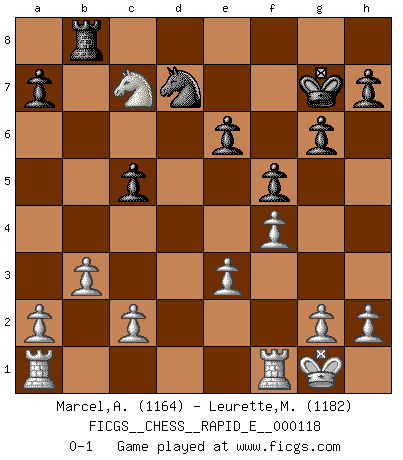 Last move : 0-1 2013 December 31 10:12:2 [Event "FICGS__CHESS__RAPID_E__000118"] [Site "FICGS"] [Date "2013.11.05"] [Round "1"] [White "Marcel,Alexis"] [Black "Leurette,Marc-Antoine"] [Result "0-1"] [WhiteElo "1164"] [BlackElo "1182"] 1.f4 d5 2.Nf3 g6 3.e3 Bg7 4.Be2 Bg4 5.O-O Bxf3 6.Bxf3 Nf6 7.b3 d4 8.Bxb7 Nc6 9.Bxc6+ Nd7 10.Bxa8 Qxa8 11.Bb2 O-O 12.Qf3 dxe3 13.Bxg7 Kxg7 14.Qxa8 Rxa8 15.dxe3 f5 16.Nc3 e6 17.Nb5 c5 18.Nc7 Rb8 0-1 This chess game has been lost on time (started : 2013.11.05 9:14:0) Bird's Opening Kingside Castling by player White (move 5) Kingside Castling by player Black (move 11) Player Black won this chess game. Follow this game move after move (download)Do you realize Fischer almost never has any bad pieces? He exchanges them, and the bad pieces remain with his opponents. (Yuri Balashov) Obwohl ich alt bin, darf mir niemand den Finger in den Mund stecken, sonst beisse ich. (Wilhelm Steinitz) El estómago es una parte esencial del maestro de Ajedrez. (Bent Larsen) Toutes choses étant égales, c'est la conviction qui gagne. Alliée à une volonté de vaincre, elle sert de détonateur, suscite des idées, disperse les doutes et aide à penser clairement. (Robert Fischer) Knowledge rests not upon truth alone, but upon error also. (Carl G. Jung)