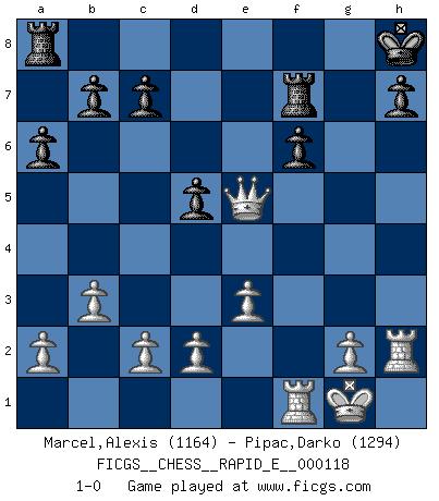 Last move : 1-0 2013 November 13 9:31:3 [Event "FICGS__CHESS__RAPID_E__000118"] [Site "FICGS"] [Date "2013.11.05"] [Round "1"] [White "Marcel,Alexis"] [Black "Pipac,Darko"] [Result "1-0"] [WhiteElo "1164"] [BlackElo "1294"] 1.f4 d5 2.Nf3 Nf6 3.e3 Bg4 4.Be2 Nc6 5.O-O a6 6.b3 Bxf3 7.Bxf3 e5 8.fxe5 Nxe5 9.Bb2 Bd6 10.Nc3 O-O 11.Ne2 Nxf3+ 12.Rxf3 Qe7 13.Bxf6 gxf6 14.Nf4 f5 15.Rg3+ Kh8 16.Qh5 Bxf4 17.Rh3 Bxh2+ 18.Rxh2 f6 19.Qxf5 Rf7 20.Rf1 Qe5 21.Qxe5 1-0 Bird's Opening Kingside Castling by player White (move 5) Kingside Castling by player Black (move 10) Player White won this chess game. Follow this game move after move (download)The older I grow, the more I value pawns. (Paul Keres) Die starken Figuren des Gegners muss man abtauschen. (José Raúl Capablanca) El Ajedrez, como la música, como el amor, tiene el poder de hacer feliz a la gente. (Siegbert Tarrasch) Botvinnik disait en comparant les échecs à la musique: Il existe une science dont le but est l'étude de l'acoustique et des sons. Mais il y a aussi un art qui se sert de l'océan des sons : c'est la musique. De toute évidence, il en est de même pour la pensée. La logique est l'étude des lois de la réflexion et les échecs reflètent, en tant qu'art, le côté logique de la réflexion, sous la forme d'images artistiques... Extrait de Fischer - Spassky, Reykjavik 1972 par Alexander & F. Wyndham (Ed. Solar), p 37. You must have a dream in order to have it come true. (A.P.J. Kalam)