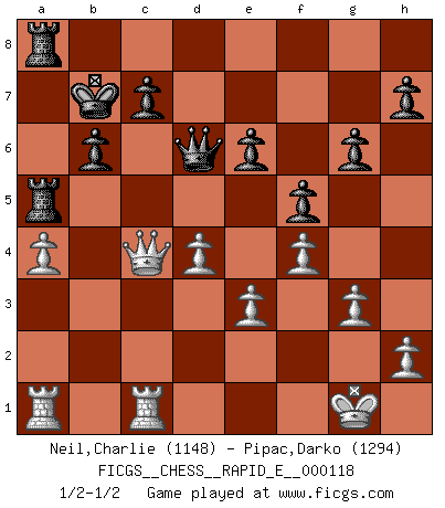 Last move : 1/2-1/2 2013 December 4 15:4:44 [Event "FICGS__CHESS__RAPID_E__000118"] [Site "FICGS"] [Date "2013.11.05"] [Round "1"] [White "Neil,Charlie"] [Black "Pipac,Darko"] [Result "1/2-1/2"] [WhiteElo "1148"] [BlackElo "1294"] 1.d4 f5 2.Bg5 g6 3.g3 Bh6 4.Bxh6 Nxh6 5.Bg2 d5 6.Nc3 e6 7.Qd2 Nf7 8.Nf3 Nc6 9.a3 a6 10.Na4 Bd7 11.Nc5 b6 12.Nd3 Qf6 13.e3 a5 14.O-O Ng5 15.Nfe5 Nxe5 16.Nxe5 O-O-O 17.Qc3 Ne4 18.Qd3 Kb7 19.f3 Ng5 20.c4 Nf7 21.Nxf7 Qxf7 22.Rfb1 Qe7 23.b4 Ra8 24.bxa5 Rxa5 25.cxd5 Rxd5 26.a4 Ra5 27.Qd2 Rha8 28.f4 Bc6 29.Bxc6+ Kxc6 30.Qc2+ Kb7 31.Qc4 Qd6 32.Rc1 1/2-1/2 Dutch, 2.Bg5 variation Kingside Castling by player White (move 14) Queenside Castling by player Black (move 16) This chess game ended in a draw. Follow this game move after move (download)I am still a victim of Chess. It has all the beauty of art and much more. It cannot be commercialized. Chess is much purer than art in its social position. (Marcel Duchamp) Wenn man heute mit 14 Jahren noch kein GM ist, kann man es vergessen. (Viswanathan Anand) Los tropiezos estan todos ahí en el tablero, esperando que se cometan. (Savielly Tartakover) Mon pion favori sur ma case favorite ! Bronstein en parlant d'un coup de pion en h5 quand il avait les Noirs. The message for business people contemplating their place in the cyberspace is simple and direct: get linked or get lost. (Vic Sussman and Kenan Pollack)