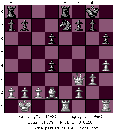 Last move : 1-0 2013 December 5 22:4:38 [Event "FICGS__CHESS__RAPID_E__000118"] [Site "FICGS"] [Date "2013.11.05"] [Round "1"] [White "Leurette,Marc-Antoine"] [Black "Kehayov,Yulian"] [Result "1-0"] [WhiteElo "1182"] [BlackElo "0996"] 1.e4 e5 2.Nf3 d5 3.exd5 Qxd5 4.Nc3 Qe6 5.Qe2 Bd6 6.d3 h6 7.Bd2 Nc6 8.O-O-O Nf6 9.g3 Bd7 10.h4 O-O 11.Kb1 Nd5 12.Bh3 Qe7 13.Nxd5 Qe6 14.Bxe6 Bxe6 15.Nc3 Ne7 16.d4 Bg4 17.Ne4 exd4 18.Nxd6 cxd6 19.Rde1 Rfe8 20.Qe4 Bxf3 21.Qxf3 1-0 QP counter-gambit (elephant gambit) Queenside Castling by player White (move 8) Kingside Castling by player Black (move 10) Player White won this chess game. Follow this game move after move (download)Fischer sacrificed virtually everything most of us weakies (to use his term) value, respect, and cherish, for the sake of an artful, often beautiful board game, for the ambivalent privilege of being its greatest master. (Paul Kollar) Verschiedene, sehr schätzbare und im Laufe des Lebens nützliche Eigenschaften des Geistes können durch das Schachspiel erworben und gekräftigt werden, so dass sie zu Gewohnheiten werden, die uns nie im Stich lassen. (Benjamin Franklin) Cuando tu no sabes absolutamente que mas hacer, es tiempo de entrar en pánico. (John van der Wiel) Les échecs sont utiles à l'exercice de la faculté de penser et à celle de l'imagination. Car nous devons posséder une méthode élaborée pour atteindre des buts partout où nous devons conduire notre raison. (Leibnitz) Hold em is to stud what chess is to checkers. (Johnny Moss)