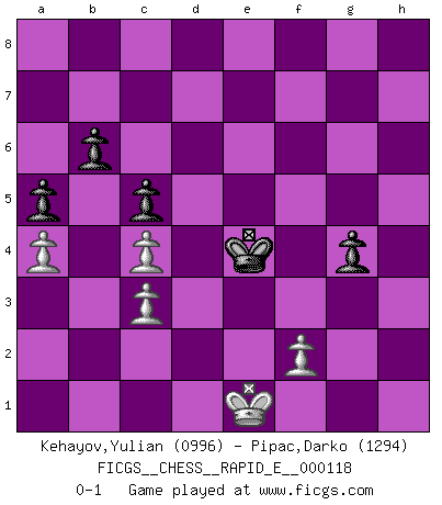 Last move : 0-1 2014 March 19 16:10:32 [Event "FICGS__CHESS__RAPID_E__000118"] [Site "FICGS"] [Date "2013.11.05"] [Round "1"] [White "Kehayov,Yulian"] [Black "Pipac,Darko"] [Result "0-1"] [WhiteElo "0996"] [BlackElo "1294"] 1.d4 f5 2.c4 e6 3.Nc3 Nf6 4.e3 Bb4 5.Bd2 Nc6 6.a3 Bxc3 7.Bxc3 a6 8.Nf3 h6 9.Be2 Ne4 10.O-O Nxc3 11.bxc3 b6 12.d5 Ne7 13.dxe6 dxe6 14.Ne5 O-O 15.h3 Bb7 16.Qd4 Nc6 17.Nxc6 Bxc6 18.Qxd8 Raxd8 19.Rfd1 a5 20.Rxd8 Rxd8 21.Rd1 Rxd1+ 22.Bxd1 Kf7 23.Kh2 Kf6 24.Kg3 g5 25.Bf3 Bxf3 26.Kxf3 Ke5 27.a4 h5 28.g3 g4+ 29.hxg4 hxg4+ 30.Ke2 Ke4 31.Kd2 e5 32.Ke2 c6 33.Kd2 Kf3 34.Ke1 f4 35.gxf4 exf4 36.exf4 Kxf4 37.Ke2 c5 38.Kd2 Kf3 39.Ke1 Ke4 0-1 This chess game has been lost on time (started : 2013.11.05 9:14:0) Dutch defense, Rubinstein variation Kingside Castling by player White (move 10) Kingside Castling by player Black (move 14) 10 pieces endgame at move 36 : White KPPPP , Black KPPPP WHITE : King + 4 Pawns BLACK : King + 4 Pawns Player Black won this chess game. Follow this game move after move (download)The chessboard is the world, the pieces are the phenomena of the Universe, the rules of the game are what we call the laws of Nature and the player on the other side is hidden from us. (Thomas Huxley) Die Arbeit ist etwas Unnatürliches. Die Faulheit allein ist göttlich. (Anatole France) Los Peones son nacidos libres, y aún así, se encuentran por doquier encadenados. (Rick Kennedy) La tactique est l'élément le plus important du milieu de jeu. (Siegbert Tarrasch) What doesn't kill us makes us stronger. (Friedrich Nietzsche)