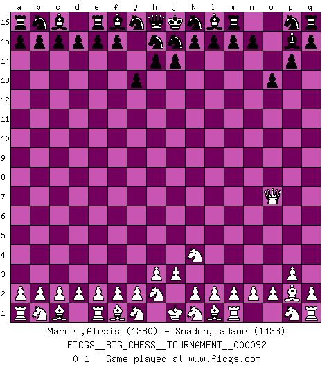 Last move : 0-1 2013 November 9 12:2:0 [Event "FICGS__BIG_CHESS__TOURNAMENT__000092"] [Site "FICGS"] [Date "2013.11.06"] [Round "1"] [White "Marcel,Alexis"] [Black "Snaden,Ladane"] [Result "0-1"] [WhiteElo "1280"] [BlackElo "1433"] 1.p2-p3 p15-p14 2.o1-p2 o16-p15 3.j2-k4 g15-g13 4.h1-o7 o15-o13 0-1 Follow this game move after move (download)Chess is mental torture. (Garry Kasparov) Ein Remis kann durch Wiederholung von drei Zügen oder durch einen schlechte Zug erreicht werden. (Savielly Grigorievitsch Tartakower) El estómago es una parte esencial del maestro de Ajedrez. (Bent Larsen) D'abord les bases : Jouez et étudiez, puis étudiez et jouez, ensuite jouez et étudiez, puis étudiez et jouez. Deuxièmement : Donnez toujours le meilleur de vous-même ! (Ken Smith) Computers are like Old Testament gods; lots of rules and no mercy. (Joseph Campbell)