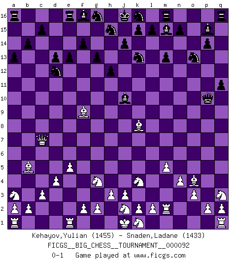 Last move : 0-1 2014 March 23 4:23:27 [Event "FICGS__BIG_CHESS__TOURNAMENT__000092"] [Site "FICGS"] [Date "2013.11.06"] [Round "1"] [White "Kehayov,Yulian"] [Black "Snaden,Ladane"] [Result "0-1"] [WhiteElo "1455"] [BlackElo "1433"] 1.j2-k4 p15-p14 2.h2-g4 g15-g13 3.h1-o7 h14-h13 4.o7-o15 p16-q14 5.o15-f7 f15-f14 6.d2-d4 o16-p15 7.c2-c3 m15-m13 8.m2-m4 j15-k13 9.n2-n4 e15-e13 10.e2-e4 h16-o10 11.o2-o3 b16-c14 12.e4-e5 c14-d12 13.m4-m5 d15-d13 14.c1-k8 q14-o13 15.l1-o4 q15-q13 16.b1-a3 c16-j10 17.f7-b7 b15-b14 18.f1-b5 l16-m15 19.o1-f9 o10-p10 20.m1-m2 q13-q12 21.p1-q3 q12-q11 22.b7-c7 h13-h12 23.g1-j2 a15-a13 0-1 This big chess game has been lost on time (started : 2013.11.06 20:9:36) Follow this game move after move (download)With or without the title, Bobby Fischer was unquestionably the greatest player of his time. (Burt Hochberg) Wenn ich Weiß habe gewinne ich weil ich Weiß habe, wenn ich Schwarz habe gewinne ich weil ich Bogoljubov bin. (Efim Bogoljubov) No todos los artistas son jugadores de Ajedrez, pero todos los jugadores de Ajedrez son artistas. (Marcel Duchamp) La tactique, c'est ce que vous faites quand il y a quelque chose à faire; la stratégie, c'est ce que vous faites quand il n'y a rien à faire. (Savielli Tartacower) Life is painting a picture, not doing a sum. (Oliver Wendell Holmes, Jr.)