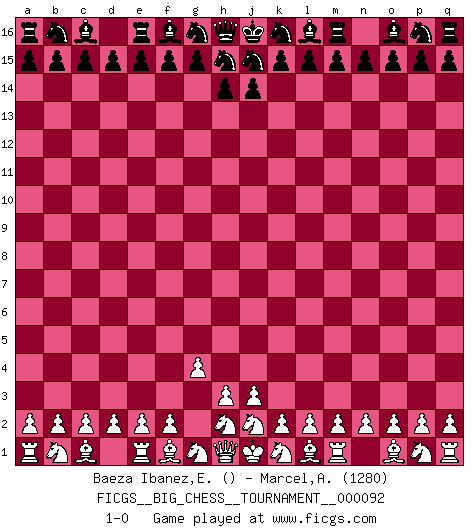 Last move : 1-0 2013 November 12 12:51:52 [Event "FICGS__BIG_CHESS__TOURNAMENT__000092"] [Site "FICGS"] [Date "2013.11.06"] [Round "1"] [White "Baeza Ibanez,Eduardo Alex"] [Black "Marcel,Alexis"] [Result "1-0"] [WhiteElo ""] [BlackElo "1280"] 1.g2-g4 1-0 Follow this game move after move (download)As one by one I mowed them down, my superiority soon became apparent. (Jose Capablanca) Bis jetzt ist Weiß einer wohlbekannten Analyse gefolgt. Aber jetzt begeht er einen schrecklichen Fehler: Er beginnt seinen eigenen Kopf zu benutzen. (Siegbert Tarrasch) Ser exitoso en el Ajedrez te permite descubrir tu propia personalidad. Eso es lo que deseo para los niños de mi clase. (Saudin Robovic) Toutes choses étant égales, c'est la conviction qui gagne. Alliée à une volonté de vaincre, elle sert de détonateur, suscite des idées, disperse les doutes et aide à penser clairement. (Robert Fischer) Looking at the proliferation of personal web pages on the Net, it looks like very soon everyone on Earth will have 15 megabytes of fame. (M.G. Sriram)