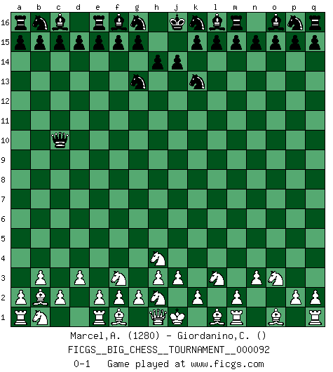 Last move : 0-1 2013 November 9 12:2:8 [Event "FICGS__BIG_CHESS__TOURNAMENT__000092"] [Site "FICGS"] [Date "2013.11.06"] [Round "1"] [White "Marcel,Alexis"] [Black "Giordanino,Claudio"] [Result "0-1"] [WhiteElo "1280"] [BlackElo ""] 1.b2-b3 j15-k13 2.c1-b2 h16-o10 3.j2-h4 o10-o2 4.p1-o3 o2-j7 5.d2-d3 h15-g13 6.n2-n3 j7-f7 7.g1-f3 f7-l2 8.k1-l3 l2-c10 0-1 Follow this game move after move (download)If I win a tournament, I win it by myself. I do the playing. Nobody helps me. (Bobby Fischer) Die meiste Zeit treffe ich auf Gegner, die meine Enkel sein könnten. Ich bin da, um ihnen zu zeigen, dass sie von mir noch einiges lernen können. (Viktor Kortschnoi) Combinaciones deslumbrantes son para la mayoría, mover madera es para los pocos. (Georg Kieninger) Il vaut mieux sacrifier les pièces de l'adversaire. (Xavier Tartacover) Just because you do not take an interest in politics doesn't mean politics won't take an interest in you. (Pericles 430 B.C.)