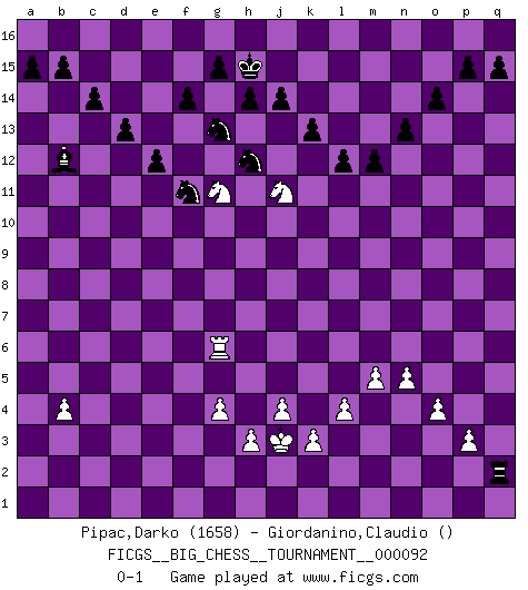 Last move : 0-1 2013 December 11 13:31:59 [Event "FICGS__BIG_CHESS__TOURNAMENT__000092"] [Site "FICGS"] [Date "2013.11.06"] [Round "1"] [White "Pipac,Darko"] [Black "Giordanino,Claudio"] [Result "0-1"] [WhiteElo "1658"] [BlackElo ""] 1.j2-k4 h15-g13 2.p2-p3 j15-k13 3.h2-g4 h16-o10 4.p1-o3 e15-e13 5.o1-p2 m15-m13 6.b1-c3 d15-d13 7.b2-b3 n15-n13 8.c1-b2 o10-n11 9.h1-m5 c15-c14 10.g1-f3 p16-q14 11.k1-l3 l16-p12 12.e2-e3 b16-a14 13.f1-c4 l15-l14 14.m2-m3 f16-b12 15.l1-m2 c16-l8 16.m5-n5 n11-p11 17.f3-h4 o15-o14 18.l3-k5 o16-f8 19.n5-k8 p11-j11 20.k4-l6 f8-m2 21.o3-m2 k16-h15 22.g4-h6 g16-j15 23.l6-j7 l8-h11 24.h6-g8 e16-e14 25.o2-o4 m13-m12 26.h4-g6 k13-l11 27.k5-l7 j15-k13 28.l7-k9 l11-k9 29.j7-k9 j11-k12 30.g6-j7 k13-l11 31.g8-h10 g13-j12 32.b2-a3 k12-k13 33.c4-b5 h11-b5 34.c3-b5 j12-h10 35.a3-h10 k13-b5 36.k9-l11 b5-e5 37.j1-j2 e5-l11 38.m2-l4 e13-e12 39.j7-k9 l11-n9 40.p2-o3 h15-g13 41.o3-p4 n9-f2 42.e1-g1 f2-d2 43.e3-e4 d2-c2 44.k9-j11 e14-f14 45.j11-g12 f14-f2 46.j2-h2 c2-e4 47.k8-h8 e4-g6 48.a1-f1 f2-a2 49.g12-e13 f15-f14 50.e13-g14 g6-h5 51.h8-h5 p12-h5 52.k2-k3 j16-h15 53.g14-h12 m16-m13 54.f1-f5 h5-p12 55.g1-f1 a2-a10 56.f1-f2 a10-h10 57.h12-f13 q14-o13 58.f5-k5 o13-m14 59.m1-f1 m14-k13 60.f2-f5 m13-l13 61.j3-j4 l13-l10 62.n2-n4 p12-l8 63.p4-q5 l10-k10 64.k5-k10 h10-k10 65.l4-m6 l8-p12 66.n4-n5 q16-m16 67.h2-j2 m16-m13 68.l2-l4 m13-l13 69.m3-m4 l13-l11 70.b3-b4 l11-f11 71.f5-f11 g13-f11 72.m6-n8 p12-m9 73.f1-e1 k10-k8 74.n8-o6 m9-q5 75.o6-q5 a16-e16 76.q5-o6 e16-e13 77.f13-e11 e13-g13 78.g2-g4 g13-g9 79.q1-f1 g9-e9 80.e1-e9 b12-e9 81.e11-g10 e9-b12 82.o6-m7 k8-q8 83.j2-j3 q8-q2 84.m7-k8 k13-h12 85.g10-j11 k15-k13 86.k8-h9 l14-l13 87.f1-f6 l13-l12 88.h9-g11 a14-c15 89.f6-g6 c15-e14 90.m4-m5 e14-g13 0-1 Follow this game move after move (download)The game of chess is the touchstone of the intellect. (Goethe) Meine Liebe ist Schach, Schach, Schach. Ich muss jeden Tag Schach spielen, deshalb fühle ich mich so stark. (Miguel Najdorf) Debemos de asegurarnos de que el Ajedrez no se convierta en un lenguaje muerto, muy interesante, pero solo para un grupo muy pequeño. (Sytze Faber) Pour se monter efficace, un Cavalier a besoin d'avant-postes ! Les Cavaliers font les meilleurs bloqueurs de pions passés. The faster the computer, the slower the brain. (Thibault de Vassal)