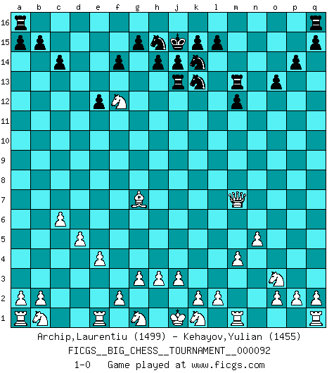 Last move : 1-0 2014 March 20 16:14:10 [Event "FICGS__BIG_CHESS__TOURNAMENT__000092"] [Site "FICGS"] [Date "2013.11.06"] [Round "1"] [White "Archip,Laurentiu"] [Black "Kehayov,Yulian"] [Result "1-0"] [WhiteElo "1499"] [BlackElo "1455"] 1.g2-g3 j15-k13 2.p1-o3 h16-o10 3.j2-k4 h15-g13 4.d2-d4 o10-f10 5.h2-g4 n15-n13 6.h1-d5 m15-m13 7.c2-c4 d15-d13 8.d5-d13 c15-c14 9.d13-j8 e15-e13 10.e2-e4 f16-b12 11.c1-j7 f10-d10 12.d4-d5 m13-m12 13.c4-c5 o16-f8 14.c5-c6 p15-p14 15.j8-l6 p16-o14 16.j7-p13 m16-m14 17.m2-m3 l16-p12 18.l1-m2 o14-n12 19.p13-h6 f8-h6 20.g4-h6 j16-h15 21.k4-j6 d10-h6 22.m2-h6 c16-l8 23.h6-b12 b16-a14 24.b12-f8 m14-m13 25.f1-e2 n12-m10 26.j6-h8 a14-c13 27.e2-l8 m10-l8 28.l6-p10 p12-o11 29.p10-o11 m13-m15 30.o11-l8 c13-d11 31.n2-n4 g16-j15 32.m3-m4 j15-h13 33.o1-d11 h15-j15 34.l8-l13 h13-k14 35.l13-n13 k16-h15 36.d11-h15 g13-h15 37.n4-n5 e13-e12 38.n13-q10 o15-o13 39.f8-g7 m15-m13 40.h8-g10 e16-e13 41.q10-j10 e13-j13 42.j10-m7 f15-f14 43.g10-f12 1-0 This big chess game has been lost on time (started : 2013.11.06 20:9:36) Follow this game move after move (download)Chess is no whit inferior to the violin, and we have a large number of professional violinists. (Mikhail Botvinnik) Es ist im Leben wie im Schachspiel. Wir entwerfen einen Plan, dieser bleibt jedoch bedingt durch das, was im Schachspiel dem Gegner, im Leben dem Schicksal zu tun belieben wird. (Arthur Schopenhauer) Tu sabes que vas a perder. Aún cuando tenía la ventaja, yo sabía que iba a perder. - al estar jugando con Fischer (Andrew Soltis) Celui qui prend des risques peut perdre, celui qui n'en prend pas perd toujours. (Xavier Tartacover) A good aphorism is too hard for the tooth of time, and is not worn away with the centuries, although it serves as food for every speech. (Friedrich Nietzsche)