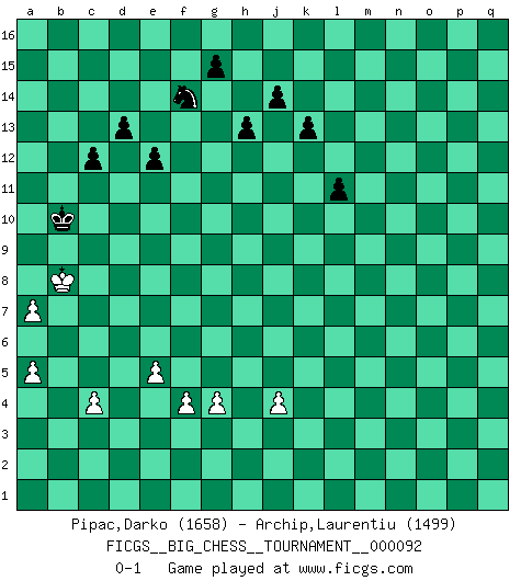 Last move : 0-1 2014 January 7 22:20:38 [Event "FICGS__BIG_CHESS__TOURNAMENT__000092"] [Site "FICGS"] [Date "2013.11.06"] [Round "1"] [White "Pipac,Darko"] [Black "Archip,Laurentiu"] [Result "0-1"] [WhiteElo "1658"] [BlackElo "1499"] 1.j2-k4 p16-o14 2.h2-g4 j15-k13 3.p2-p3 c15-c14 4.p1-o3 e15-e13 5.b2-b3 h16-m12 6.b1-c3 f16-c13 7.n2-n3 c13-h8 8.c1-b2 p15-p13 9.h1-m5 o16-p15 10.m5-m12 h8-m12 11.o1-p2 o14-n12 12.e2-e3 m12-c3 13.b2-c3 p15-c3 14.d2-c3 d15-d13 15.g1-f3 c16-l8 16.k1-l3 l8-g4 17.h3-g4 o15-o13 18.k2-k3 b16-d15 19.e1-d1 m15-m13 20.j3-j4 q15-q13 21.f3-h4 n15-n13 22.f2-f3 p13-p12 23.e3-e4 q13-q12 24.f1-b5 l16-m15 25.c3-c4 k13-l11 26.b5-m15 m16-m15 27.j1-j2 o13-o12 28.h4-j6 p12-p11 29.l1-h4 q12-q11 30.o3-m4 o12-o11 31.l3-k5 o11-o10 32.k4-l6 p11-p10 33.j6-k8 o10-o9 34.k5-l7 q11-q10 35.l7-m9 l11-m9 36.k8-m9 n12-m10 37.l6-m8 k16-l14 38.m4-l6 p10-p9 39.l6-n7 o9-o8 40.n7-o9 m10-o9 41.m8-o9 m13-m12 42.o2-o4 n13-n12 43.q2-q4 n12-n11 44.m9-k10 l14-k12 45.k10-l12 n11-n10 46.l12-n13 m15-m13 47.n13-p14 q16-q14 48.p14-o12 m13-o13 49.o9-p11 o13-o12 50.p11-n10 o12-n12 51.n10-p11 n12-n8 52.p11-o13 q14-o14 53.o13-m12 g16-j15 54.p3-p4 j15-l14 55.m12-l14 o14-l14 56.l2-l3 j16-j15 57.p4-p5 e16-m16 58.p2-o3 m16-m12 59.o3-q5 n8-f8 60.h4-e7 f8-m8 61.e7-k12 m12-k12 62.q5-f15 a16-m16 63.q1-q2 h14-h13 64.f15-e14 h15-f14 65.e14-d15 f14-d15 66.d1-d5 k12-l12 67.d5-a5 a15-a14 68.a5-b5 b15-b14 69.b5-f5 d15-f14 70.a1-d1 l12-m12 71.a2-a4 m8-m2 72.m1-m2 m12-m2 73.q2-m2 m16-m2 74.j2-h3 l14-l3 75.f5-k5 l3-n3 76.d1-d10 m2-m3 77.d10-q10 m3-k3 78.k5-k3 n3-k3 79.h3-h4 k3-k4 80.q10-q9 k4-o4 81.q9-p9 o4-q4 82.p9-o9 q4-p4 83.o9-o8 p4-p5 84.o8-o16 p5-p1 85.o16-d16 c14-c13 86.d16-d14 p1-c1 87.d14-b14 c1-c2 88.b14-a14 c2-g2 89.a14-e14 e13-e12 90.e14-e15 j15-h15 91.e15-b15 g2-c2 92.f3-f4 c2-c3 93.e4-e5 l15-l13 94.a4-a5 k15-k13 95.a5-a6 c13-c12 96.a6-a7 c3-c2 97.b15-b4 c2-a2 98.b4-a4 a2-a4 99.b3-a4 h15-g14 100.h4-g5 g14-f13 101.g5-f6 f13-e13 102.f6-e7 e13-d12 103.e7-d8 d12-c11 104.a4-a5 c11-b10 105.d8-c8 l13-l12 106.c8-b8 l12-l11 0-1 Follow this game move after move (download)I like to say that Bobby Fischer was the greatest player ever. But what made Fischer a genius was his ability to blend an American freshness and pragmatism with Russian ideas about strategy. (Bruce Pandolfini) Kasparov ist eine Art Monster mit hundert Augen, denen auch nicht das Geringste entgeht. (Tony Miles) Botvinnik trataba de restarle el misterio al Ajedrez, siempre relacionandolo a situaciones de la vida ordinaria. El gustaba de llamar al Ajedrez un típico problema inexacto similar a aquellos de los cuales la gente siempre tiene que enfrentarse en la vida cotidiana. (Garry Kasparov) La solitude du joueur d'Echecs à l'approche du mat est semblable à celle du condamné. (Francis Szpiner) O divine art of subtlety and secrecy! Through you we learn to be invisible, through you inaudible and hence we can hold the enemy's fate in our hands. (Sun Tzu)