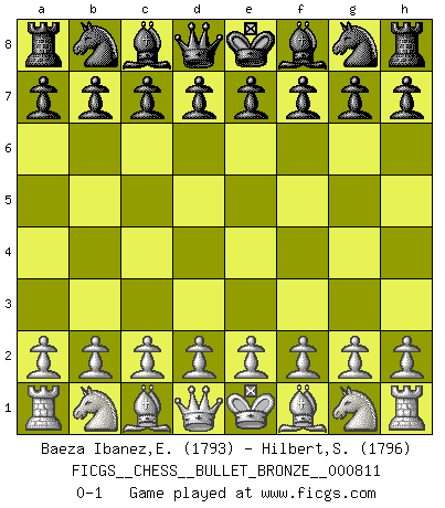 Last move : 0-1 2013 November 8 6:17:32 [Event "FICGS__CHESS__BULLET_BRONZE__000811"] [Site "FICGS"] [Date "2013.11.08"] [Round "1"] [White "Baeza Ibanez,Eduardo Alex"] [Black "Hilbert,Stephan J."] [Result "0-1"] [WhiteElo "1793"] [BlackElo "1796"] 0-1 This chess game has been lost on time (started : 2013.11.08 0:12:38) Player Black won this chess game. Follow this game move after move (download)Fischer is the strongest player in the world. In fact, the strongest player who ever lived. (Larry Evans) Gegen einen Schachcomputer zu verlieren ist wie Löcher in den Strümpfen zuhaben. Es ist nicht peinlich, solange man der einzige ist der es weiß. (Anonymous) El arma más poderosa en el Ajedrez, es tener la próxima movida. (David Bronstein) 'L'échange des dames est un coup dur pour les deux adversaires...' Un journaliste lors d'une partie du match Spassky-Fischer If passion drives you, let reason holds the reins. (Benjamin Franklin)