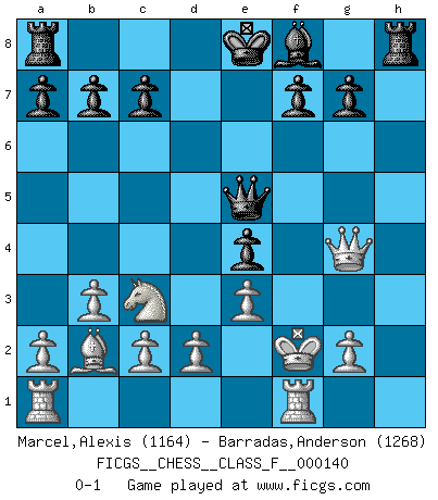 Last move : 0-1 2014 January 13 22:54:44 [Event "FICGS__CHESS__CLASS_F__000140"] [Site "FICGS"] [Date "2013.11.11"] [Round "1"] [White "Marcel,Alexis"] [Black "Barradas,Anderson"] [Result "0-1"] [WhiteElo "1164"] [BlackElo "1268"] 1.f4 d6 2.Nf3 Bg4 3.e3 e5 4.fxe5 dxe5 5.Be2 Bxf3 6.Bxf3 Nc6 7.O-O Nf6 8.b3 e4 9.Be2 Qd6 10.Bb2 Ne5 11.Nc3 Neg4 12.Bxg4 h5 13.Bh3 Ng4 14.Bxg4 hxg4 15.Qxg4 Qxh2+ 16.Kf2 Qe5 0-1 Bird's Opening Kingside Castling by player White (move 7) Player Black won this chess game. Follow this game move after move (download)The laws of Chess do not permit a free choice: you have to move whether you like it or not. (Emanuel Lasker) Taktik ist was man tun muß, wenn etwas zu tun ist. Strategie ist was man tun muß, wenn nichts zu tun ist. (Savielly Grigorievitsch Tartakower) ¿Cual es el objetivo de jugar una apertura de gambito?... Para adquirir una reputación de ser un jugador apuesto a costo de perder el juego. (Siegbert Tarrasch) Les Echecs ne sont pas pour les âmes timides. Ils requièrent un homme entier, qui ne s'arrête pas aveuglément à ce qui a été déjà établi, mais qui tente individuellement de sonder les profondeurs du jeu. (W. Steinitz) It is the aim of the modern school, not to treat every position according to one general law, but according to the principle inherent in the position. (Richard Reti)