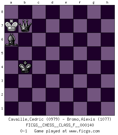 Last move : 0-1 2013 November 14 20:23:53 [Event "FICGS__CHESS__CLASS_F__000140"] [Site "FICGS"] [Date "2013.11.11"] [Round "1"] [White "Cavaille,Cedric"] [Black "Bromo,Alexis"] [Result "0-1"] [WhiteElo "0979"] [BlackElo "1077"] 1.e4 e5 2.Nf3 Nc6 3.Bb5 d6 4.Bxc6+ bxc6 5.d3 h6 6.c4 c5 7.Nc3 Nf6 8.a4 c6 9.O-O Be7 10.a5 Be6 11.Qa4 Rc8 12.a6 O-O 13.Qa5 Qxa5 14.Rxa5 d5 15.cxd5 cxd5 16.exd5 Nxd5 17.Nxd5 Bxd5 18.Nxe5 Bd6 19.d4 Rfe8 20.Be3 Bxe5 21.dxe5 Rxe5 22.Rxc5 Rxc5 23.Bxc5 Bc4 24.Rb1 Rxc5 25.f4 Bxa6 26.Ra1 Rc6 27.g3 f5 28.b4 Rb6 29.Rb1 Bb5 30.Kf2 a6 31.h3 Bc6 32.Rc1 Kf7 33.Ke3 Ke6 34.g4 fxg4 35.hxg4 Kd5 36.Rd1+ Kc4 37.Rd4+ Kb3 38.f5 Rxb4 39.Rxb4+ Kxb4 40.Kf4 a5 41.g5 hxg5+ 42.Kxg5 Be8 43.f6 gxf6+ 44.Kxf6 a4 45.Ke7 Bb5 46.Kd6 a3 47.Kd5 a2 48.Ke4 a1Q 49.Kd5 Qe1 50.Kd6 Qe4 51.Kc7 Qe6 52.Kb7 Qc6+ 53.Kb8 Ba6 54.Ka7 Qb7+ 0-1 Ruy Lopez : Old Steinitz defense Kingside Castling by player White (move 9) Kingside Castling by player Black (move 12) 10 pieces endgame at move 38 : White KRPP , Black KRBPPP WHITE : King + 1 Rook 2 Pawns BLACK : King + 1 Rook 1 Bishop 3 Pawns 9 pieces endgame at move 39 : White KRPP , Black KBPPP WHITE : King + 1 Rook 2 Pawns BLACK : King + 1 Bishop 3 Pawns 8 pieces endgame at move 39 : White KPP , Black KBPPP WHITE : King + 2 Pawns BLACK : King + 1 Bishop 3 Pawns 7 pieces endgame at move 41 : White KP , Black KBPPP WHITE : King + 1 Pawn BLACK : King + 1 Bishop 3 Pawns 6 pieces endgame at move 42 : White KP , Black KBPP WHITE : King + 1 Pawn BLACK : King + 1 Bishop 2 Pawns 5 pieces endgame at move 43 : White K , Black KBPP WHITE : King + BLACK : King + 1 Bishop 2 Pawns 4 pieces endgame at move 44 : White K , Black KBP WHITE : King + BLACK : King + 1 Bishop 1 Pawn Promotion Queen by player Black (move 48) Player Black won this chess game. Follow this game move after move (download)Fischer Chess play was always razor-sharp, rational and brilliant. One of the best ever. (Dave Regis) Ich verachte die Medien. (Robert James Fischer) Morphy probablemente fue el genio más grande de todos. (Bobby Fischer) Pour se monter efficace, un Cavalier a besoin d'avant-postes ! Les Cavaliers font les meilleurs bloqueurs de pions passés. The next best thing to gambling and winning is gambling and loosing. (Nick Dandalos)