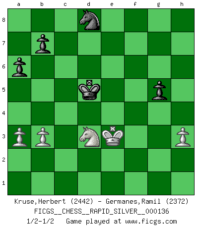 Last move : 1/2-1/2 2014 January 16 23:32:57 [Event "FICGS__CHESS__RAPID_SILVER__000136"] [Site "FICGS"] [Date "2013.11.14"] [Round "1"] [White "Kruse,Herbert"] [Black "Germanes,Ramil"] [Result "1/2-1/2"] [WhiteElo "2442"] [BlackElo "2372"] 1.e4 c5 2.Nf3 d6 3.d4 cxd4 4.Nxd4 Nf6 5.Nc3 a6 6.Be3 e5 7.Nb3 Be6 8.h3 Be7 9.f4 exf4 10.Bxf4 O-O 11.Qf3 Nc6 12.O-O-O Qb6 13.g4 Ne5 14.Qe2 h6 15.g5 hxg5 16.Bxg5 Nd5 17.Bxe7 Nxe7 18.Kb1 Rac8 19.Qe1 f5 20.Nd4 Bf7 21.exf5 Bh5 22.Na4 Qa7 23.Rd2 Nxf5 24.Nxf5 Rxf5 25.Bg2 Re8 26.Qe4 Rf2 27.Rxf2 Qxf2 28.Rf1 Qxf1+ 29.Bxf1 Nf3 30.Qc4+ Bf7 31.Qc3 Re1+ 32.Qxe1 Nxe1 33.Kc1 Bg6 34.Nb6 Nxc2 35.Kd2 Nb4 36.a3 Nc6 37.Nc8 d5 38.Bg2 Kf7 39.Bxd5+ Kf6 40.Nb6 Kg5 41.Na4 Bf5 42.Nc5 Bc8 43.Be6 Bxe6 44.Nxe6+ Kf6 45.Nc5 Nd8 46.Ke3 Ke5 47.b3 Kd5 48.Nd3 g5 49.Nb4+ Ke5 50.Nd3+ Kd5 51.Nb4+ Ke5 52.Nd3+ Kd5 1/2-1/2 Sicilian : Najdorf, Byrne (English) attack Kingside Castling by player Black (move 10) Queenside Castling by player White (move 12) 10 pieces endgame at move 44 : White KNPPP , Black KNPPP WHITE : King + 1 Knight 3 Pawns BLACK : King + 1 Knight 3 Pawns This chess game ended in a draw. Follow this game move after move (download)Fischer was a master of clarity and a king of artful positioning. His opponents would see where he was going but were powerless to stop him. (Bruce Pandolfini) Ein Buch ist ein Spiegel; wenn ein Affe hineinsieht, so kann kein Apostel heraus gucken. (Georg Christoph Lichtenberg) Prefiero perder una partida realmente buena, que ganar una mala. (David Levy) Vous savez, camarade Pachman, je n'éprouve pas de plaisir à être ministre, je jouerais plutôt aux échecs comme vous, ou alors ferais une révolution au Venezuela. (Che Guevara à Ludek Pachman, 'Checkmate in Prague', 1975) I find your interest interesting. (Gregory House, House M.D.)
