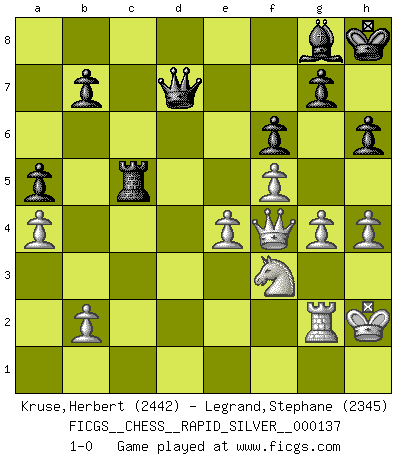 Last move : 1-0 2014 February 21 13:37:9 [Event "FICGS__CHESS__RAPID_SILVER__000137"] [Site "FICGS"] [Date "2013.11.16"] [Round "1"] [White "Kruse,Herbert"] [Black "Legrand,Stephane"] [Result "1-0"] [WhiteElo "2442"] [BlackElo "2345"] 1.d4 d5 2.c4 c6 3.Nf3 Nf6 4.Nc3 dxc4 5.a4 Bf5 6.e3 e6 7.Bxc4 Bb4 8.O-O O-O 9.Nh4 Bg4 10.f3 Bh5 11.g4 Nd5 12.Qe1 Be7 13.Ng2 Bg6 14.Qe2 h6 15.Rd1 Bb4 16.Na2 Bd6 17.Kh1 a5 18.e4 Nb6 19.Bb3 Bh7 20.Be3 Na6 21.Nc3 Qe7 22.f4 Bc7 23.Ne1 c5 24.Nf3 c4 25.Bc2 Nb4 26.Bb1 f6 27.f5 Rfe8 28.Qf2 Nd7 29.Nd2 Nd3 30.Bxd3 cxd3 31.Rg1 Kh8 32.Qf1 Nb8 33.d5 exd5 34.Nxd5 Qf7 35.Nxc7 Qxc7 36.h4 Qf7 37.Ra3 Nc6 38.Rxd3 Ne5 39.Rd4 Rad8 40.Rg2 Rxd4 41.Bxd4 Qd7 42.Bxe5 Rxe5 43.Qf4 Rc5 44.Nf3 Bg8 45.Kh2 1-0 This chess game has been lost on time (started : 2013.11.16 14:43:57) QGD Slav : Dutch variation Kingside Castling by player White (move 8) Kingside Castling by player Black (move 8) Player White won this chess game. Follow this game move after move (download)Openings teach you openings. Endgames teach you chess ! (Stephan Gerzadowicz) Schach ist die gewalttätigste aller Sportarten. (Garry Kasparov) Dejen al perfeccionista jugar por correo. (Yasser Seirawan) La victoire dans une partie d'Echecs appartient la plupart du temps à celui qui voit un peu plus loin que l'adversaire. (Lasker) Heh, heh, heh. Time to abandon ship. (General Grievous in Star Wars ep.3)