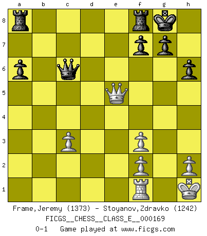 Last move : 0-1 2013 November 30 20:39:40 [Event "FICGS__CHESS__CLASS_E__000169"] [Site "FICGS"] [Date "2013.11.18"] [Round "1"] [White "Frame,Jeremy"] [Black "Stoyanov,Zdravko"] [Result "0-1"] [WhiteElo "1373"] [BlackElo "1242"] 1.e4 c5 2.Nf3 a6 3.d4 cxd4 4.Nxd4 e6 5.Nc3 h6 6.Bc4 Bb4 7.Bd2 Bxc3 8.Bxc3 Nf6 9.Bd3 O-O 10.Nf3 d6 11.O-O e5 12.Bc4 Nxe4 13.Qe1 Nxc3 14.bxc3 Nc6 15.Rd1 Bg4 16.Bd5 Qa5 17.Bxc6 bxc6 18.Rxd6 Bxf3 19.gxf3 Qxa2 20.Qxe5 Qxc2 21.Rxc6 Qa4 22.Kh1 Qxc6 0-1 Sicilian : O'Kelly variation Kingside Castling by player Black (move 9) Kingside Castling by player White (move 11) Player Black won this chess game. Follow this game move after move (download)Chess is ruthless: you've got to be prepared to kill people. (Nigel Short) Habe Mut, dich deines eigenen Verstandes zu bedienen. (Immanuel Kant) Una mala movida nulifica cuarenta buenas. (Horowitz) Que feriez-vous si vous étiez en train de jouer aux échecs et que la fin du monde arrive ? Je continuerais à jouer. (Saint Borromée) Do not put your faith in what statistics say until you have carefully considered what they do not say. (William W. Watt)