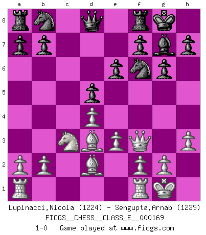 Last move : 1-0 2014 February 14 13:7:50 [Event "FICGS__CHESS__CLASS_E__000169"] [Site "FICGS"] [Date "2013.11.18"] [Round "1"] [White "Lupinacci,Nicola"] [Black "Sengupta,Arnab"] [Result "1-0"] [WhiteElo "1224"] [BlackElo "1239"] 1.d4 Nf6 2.c4 g6 3.Nc3 Bg7 4.Nf3 d5 5.e3 c6 6.Bd3 O-O 7.O-O Bg4 8.h3 Bxf3 9.Qxf3 e6 10.cxd5 cxd5 11.Bd2 1-0 This chess game has been lost on time (started : 2013.11.18 15:55:4) King's Indian defense, 3.Nc3 Kingside Castling by player Black (move 6) Kingside Castling by player White (move 7) Player White won this chess game. Follow this game move after move (download)Chess is thirty to forty percent psychology. You don't have this when you play a computer. I can't confuse it. (Judith Polgar) Wir können eben der zündenden Macht des Opfers nicht wiederstehen, denn die Begeisterung für das Opfer liegt in der Natur des Menschen. (Rudolf Spielmann) Cualquier cambio de material en una posición debe venir por medio de un mate, una captura o promoción de Peón. (Purdy) Toute estimation doit être constamment réévaluée. (Jacob Estrin) For peace of mind, resign as general manager of the universe. (Douglas Adams)