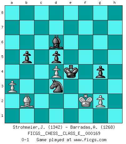 Last move : 0-1 2014 May 10 0:17:4 [Event "FICGS__CHESS__CLASS_E__000169"] [Site "FICGS"] [Date "2013.11.18"] [Round "1"] [White "Strohmeier,Josef"] [Black "Barradas,Anderson"] [Result "0-1"] [WhiteElo "1342"] [BlackElo "1268"] 1.e4 e5 2.Nf3 Nf6 3.Nxe5 d6 4.Nf3 Nxe4 5.d4 Bg4 6.Be2 Nc6 7.O-O Qf6 8.c3 Be7 9.Nbd2 Nxd2 10.Bxd2 h6 11.h3 Bh5 12.Nh2 Bxe2 13.Qxe2 O-O-O 14.Ng4 Qe6 15.Rfe1 Qxe2 16.Rxe2 Rhe8 17.Rae1 f5 18.Nh2 Rd7 19.Nf3 d5 20.Re6 Rd6 21.Rxd6 cxd6 22.Nh2 Kd7 23.Nf3 Na5 24.b3 a6 25.c4 Nc6 26.Bc3 dxc4 27.bxc4 Bf6 28.Rxe8 Kxe8 29.Kf1 Ke7 30.Ke2 b5 31.cxb5 axb5 32.a3 d5 33.Kd3 g5 34.Nd2 h5 35.f3 g4 36.hxg4 hxg4 37.Bb4+ Ke6 38.fxg4 fxg4 39.Nb3 Bh4 40.Nc5+ Kf5 41.Bd2 Ne7 42.Nb7 Bg3 43.Nd6+ Bxd6 44.Bc1 Ng6 45.Ke2 Ke4 46.Bb2 Nf4+ 47.Kf2 Nd3+ 0-1 Petrov : Classical attack Kingside Castling by player White (move 7) Queenside Castling by player Black (move 13) Player Black won this chess game. Follow this game move after move (download)Your body has to be in top condition. Your Chess deteriorates as your body does. You can't separate body from mind. (Bobby Fischer) Im Schach gewinnt jeder. Hat man Freunde am Spiel - und das ist die Hauptsache - ist auch der Verlust einer Partie kein Unglück. (David Bronstein) En manos de Fischer's, una diminuta ventaja teórica es tan buena como tener una Reina de ventaja. (Isaac Kashdan) Le succès, c'est être capable d'aller d'échec en échec sans perdre son enthousiasme. (Winston Churchill) Art is the triumph over chaos. (John Cheever)