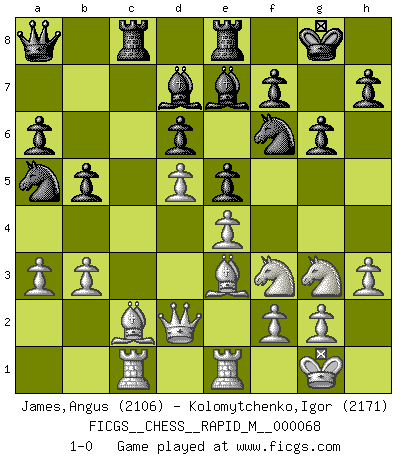 Last move : 1-0 2014 March 11 15:20:47 [Event "FICGS__CHESS__RAPID_M__000068"] [Site "FICGS"] [Date "2013.11.19"] [Round "1"] [White "James,Angus"] [Black "Kolomytchenko,Igor"] [Result "1-0"] [WhiteElo "2106"] [BlackElo "2171"] 1.e4 e5 2.Nf3 Nc6 3.Bb5 a6 4.Ba4 Nf6 5.O-O Be7 6.Re1 b5 7.Bb3 d6 8.c3 O-O 9.h3 Na5 10.Bc2 c5 11.d4 Qc7 12.Nbd2 Bd7 13.Nf1 Rfe8 14.b3 g6 15.Bg5 cxd4 16.cxd4 Nc6 17.Rc1 Rac8 18.d5 Na5 19.Ng3 Qc5 20.a3 Qa7 21.Be3 Qa8 22.Qd2 1-0 This chess game has been lost on time (started : 2013.11.19 14:36:42) Ruy Lopez : Closed Kingside Castling by player White (move 5) Kingside Castling by player Black (move 8) Player White won this chess game. Follow this game move after move (download)You know, comrade Pachman, I don't enjoy being a Minister, I would rather play Chess like you. (Che Guevara) Das Zentrum ist der Balkan des Schachbretts - Kriegshandlungen können in jedem Moment ausbrechen. (Aaron Nimzowitsch) Aún el Rey más flojo huye despavorido ante la amenaza de un Jaque doble. (Aaron Nimzowitsch) Que feriez-vous si vous étiez en train de jouer aux échecs et que la fin du monde arrive ? Je continuerais à jouer. (Saint Borromée) Empty your mind, be formless, shapeless — like water. (Bruce Lee)