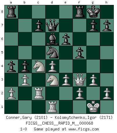Last move : 1-0 2014 February 14 13:7:50 [Event "FICGS__CHESS__RAPID_M__000068"] [Site "FICGS"] [Date "2013.11.19"] [Round "1"] [White "Conner,Gary"] [Black "Kolomytchenko,Igor"] [Result "1-0"] [WhiteElo "2101"] [BlackElo "2171"] 1.d4 Nf6 2.c4 e6 3.g3 Be7 4.Bg2 O-O 5.Nf3 d5 6.O-O dxc4 7.Qc2 a6 8.Qxc4 b5 9.Qc2 Bb7 10.Bd2 Be4 11.Qc1 Bb7 12.Bf4 Nd5 13.Nc3 Nxf4 14.Qxf4 Nd7 15.Rfd1 Nb6 16.Ne5 Bg5 17.Qg4 f5 18.Qh3 Bxg2 19.Qxg2 b4 20.Nb1 Na4 21.b3 Nb6 22.e3 Nd5 23.Nd2 a5 24.Ndc4 a4 25.Rac1 Be7 26.Nd3 Bd6 27.Rc2 Qd7 28.Qf3 1-0 This chess game has been lost on time (started : 2013.11.19 14:36:42) Catalan Opening Kingside Castling by player Black (move 4) Kingside Castling by player White (move 6) Player White won this chess game. Follow this game move after move (download)Castle early and often. (Rob Sillars) Der Schachmeister von Heute braucht Courage, einen Killerinstinkt, Ausdauer und Arroganz. (Larry Evans) Ciertamente, de todas la drogas del mundo, el Ajedrez debe ser el mas placentero permamentemente. (Assiac) Il a essayé de se convaincre qu'il pourrait empêcher toutes les erreurs et ne jamais perdre. L'horreur ! Gary Kasparov au sujet de Robert Fischer. In theory there is no difference between theory and practice. In practice there is. (Yogi Berra)