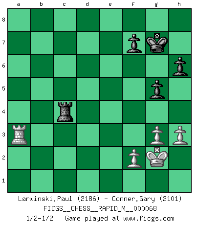 Last move : 1/2-1/2 2013 December 19 21:14:21 [Event "FICGS__CHESS__RAPID_M__000068"] [Site "FICGS"] [Date "2013.11.19"] [Round "1"] [White "Larwinski,Paul"] [Black "Conner,Gary"] [Result "1/2-1/2"] [WhiteElo "2186"] [BlackElo "2101"] 1.e4 e5 2.Nf3 Nc6 3.Bb5 a6 4.Ba4 Nf6 5.O-O Be7 6.Re1 b5 7.Bb3 O-O 8.a4 b4 9.d4 d6 10.dxe5 dxe5 11.Qxd8 Rxd8 12.Nbd2 Bd6 13.Nc4 h6 14.Nxd6 cxd6 15.Be3 Be6 16.Bb6 Rd7 17.a5 Bxb3 18.cxb3 d5 19.exd5 Rxd5 20.Rad1 Rb5 21.Nd2 Nxa5 22.Bxa5 Rxa5 23.Nc4 Rc5 24.Nxe5 Rc2 25.Nc4 Re8 26.Rxe8+ Nxe8 27.g3 Nc7 28.Rd8+ Kh7 29.Rb8 Nb5 30.Kg2 Nd4 31.Rxb4 Nxb3 32.Rxb3 Rxc4 33.Rb6 a5 34.Rb5 a4 35.b3 axb3 36.Rxb3 g5 37.h3 Kg7 38.Ra3 1/2-1/2 Ruy Lopez : Closed, 7...O-O Kingside Castling by player White (move 5) Kingside Castling by player Black (move 7) 10 pieces endgame at move 36 : White KRPPP , Black KRPPP WHITE : King + 1 Rook 3 Pawns BLACK : King + 1 Rook 3 Pawns This chess game ended in a draw. Follow this game move after move (download)When you play Bobby, it is not a question if you win or lose. It is a question if you survive. (Boris Spassky) Wenn Capablanka heute auf der Schachbühne erscheinen würde, hätte er ein halbes Jahr gebraucht um sich die Schachtheorie anzueignen. Und dann hätte er alles und jeden besiegt. (Mikhail Moiseyevich Botvinik) La vida es como un juego de Ajedrez, cambiando con cada movimiento. (Proverbio Chino) Un footballeur joue avec ses pieds, parfois avec sa tête. Un joueur d'échecs ne joue qu'avec sa tête. Et quand il ne joue plus, il meurt. (Jacob Murray) Only sick music makes money today. (Friedrich Nietzsche)