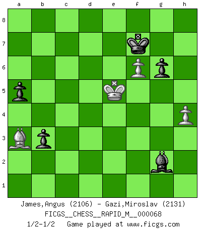 Last move : 1/2-1/2 2014 April 25 20:36:9 [Event "FICGS__CHESS__RAPID_M__000068"] [Site "FICGS"] [Date "2013.11.19"] [Round "1"] [White "James,Angus"] [Black "Gazi,Miroslav"] [Result "1/2-1/2"] [WhiteElo "2106"] [BlackElo "2131"] 1.e4 c5 2.Nf3 Nc6 3.Bb5 e6 4.O-O Nge7 5.c3 a6 6.Ba4 b5 7.Bc2 Bb7 8.Qe2 d5 9.e5 d4 10.Be4 Nd5 11.d3 dxc3 12.Nxc3 Be7 13.Rd1 O-O 14.d4 cxd4 15.Nxd5 exd5 16.Bb1 g6 17.a4 b4 18.Nxd4 Nxd4 19.Rxd4 Bc5 20.Rg4 a5 21.Bd3 Bc8 22.Rg3 Re8 23.Bf4 Bd7 24.Bc2 Bd4 25.Rd1 Bxb2 26.Rxd5 Qc8 27.Bxg6 hxg6 28.Qxb2 Qc6 29.Rgd3 Be6 30.R5d4 Rac8 31.h3 Qc2 32.Qxc2 Rxc2 33.Bg5 f6 34.Rd8 Rxd8 35.Rxd8+ Kf7 36.exf6 b3 37.Kh2 Rxf2 38.h4 Re2 39.Ra8 Rxg2+ 40.Kxg2 Bd5+ 41.Kf2 Bxa8 42.Bc1 Bc6 43.Ke3 Bxa4 44.Kd4 Bd7 45.Ke5 Bc6 46.Bb2 Bg2 47.Ba3 1/2-1/2 Sicilian : Nimzovich-Rossolimo attack (without ...d6) Kingside Castling by player White (move 4) Kingside Castling by player Black (move 13) 10 pieces endgame at move 41 : White KBPPP , Black KBPPP WHITE : King + 1 Bishop 3 Pawns BLACK : King + 1 Bishop 3 Pawns 9 pieces endgame at move 43 : White KBPP , Black KBPPP WHITE : King + 1 Bishop 2 Pawns BLACK : King + 1 Bishop 3 Pawns This chess game ended in a draw. Follow this game move after move (download)All my games are real. (Bobby Fischer) Ich liebe den Moment, wenn ich das Ego meines Gegenüber breche. (Robert James Fischer) El Ajedrez es una guerra en un tablero. El objetivo es aplastar la mente del oponente. (Bobby Fischer) A chaque perte on perd un peu de soi. (Joël Lautier) Computers have lots of memory but no imagination. (Anonymous)