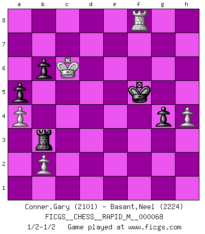 Last move : 1/2-1/2 2014 March 8 18:42:20 [Event "FICGS__CHESS__RAPID_M__000068"] [Site "FICGS"] [Date "2013.11.19"] [Round "1"] [White "Conner,Gary"] [Black "Basant,Neel"] [Result "1/2-1/2"] [WhiteElo "2101"] [BlackElo "2224"] 1.d4 d5 2.c4 c6 3.Nf3 Nf6 4.Nc3 dxc4 5.a4 Bf5 6.Ne5 e6 7.f3 Bb4 8.e4 Bxe4 9.fxe4 Nxe4 10.Bd2 Qxd4 11.Nxe4 Qxe4+ 12.Qe2 Bxd2+ 13.Kxd2 Qd5+ 14.Kc3 Na6 15.Nxc4 O-O 16.Qe5 Rad8 17.Be2 f6 18.Qxd5 cxd5 19.Na5 Rc8+ 20.Kb3 Nc5+ 21.Ka3 Rc7 22.Nb3 Nxb3 23.Kxb3 Rfc8 24.Rad1 Kf7 25.Rd3 Rc6 26.Bf3 g6 27.Rhd1 f5 28.R1d2 R8c7 29.Re3 Rb6+ 30.Ka2 Kf6 31.Rc3 Rd7 32.Rcd3 Rb4 33.Ka3 a5 34.Rc2 Rd6 35.Rc5 b6 36.Rc8 Rh4 37.h3 d4 38.Kb3 e5 39.Rc6 Rxc6 40.Bxc6 Rf4 41.Rd2 Rf1 42.Kc4 Kg5 43.Kd5 Rc1 44.Bb7 Kf6 45.Ba6 Rc7 46.Kd6 Rc5 47.h4 h5 48.g3 g5 49.Bb5 g4 50.Be8 Rc1 51.Bxh5 e4 52.Rxd4 Rg1 53.Bxg4 fxg4 54.Rxe4 Rxg3 55.Kc6 Kf5 56.Re8 Rb3 57.Rf8+ Ke4 58.Re8+ Kf5 59.Rf8+ 1/2-1/2 QGD Slav : Wiesbaden variation Kingside Castling by player Black (move 15) 10 pieces endgame at move 54 : White KRPPP , Black KRPPP WHITE : King + 1 Rook 3 Pawns BLACK : King + 1 Rook 3 Pawns This chess game ended in a draw. Follow this game move after move (download)I look one move ahead... the best ! (Siegbert Tarrasch) Ich möchte Schüler heranbilden, die das Vermögen haben, selbst zu denken und Kritik zu üben. (Emanuel Lasker) Un entendimiento minucioso de las típicas continuaciones de mate hacen de las mas complicadas combinaciones de sacrificio que conducen hacia ellas no solo no dificiles, sino casi un asunto de rutina. (Siegbert Tarrasch) Roi des jeux et jeu des rois, les échecs portent en eux un sentiment d'infini. Ils donnent à celui qui s'est efforcé d'en approfondir les arcanes l'impression de n'être pas à la mesure de l'homme; en fait, ils constituent un résumé de l'univers, un microcosme, et figurent cette grande échelle qui, dans les plans de la lumière descend jusqu'à la matière, qui des abîmes insondables remonte jusqu'en l'infini de Dieu. (Pyrame) Have no fear of perfection - you'll never reach it. (Salvador Dali)