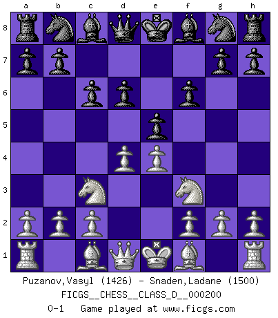 Last move : 0-1 2014 February 1 0:10:51 [Event "FICGS__CHESS__CLASS_D__000200"] [Site "FICGS"] [Date "2013.11.20"] [Round "1"] [White "Puzanov,Vasyl"] [Black "Snaden,Ladane"] [Result "0-1"] [WhiteElo "1426"] [BlackElo "1500"] 1.e4 e5 2.Nf3 d6 3.d4 f6 4.Nc3 c6 0-1 This chess game has been lost on time (started : 2013.11.20 8:24:0) Philidor's defense Player Black won this chess game. Follow this game move after move (download)It was clear to me that the vulnerable point of the American Grandmaster (Bobby Fischer) was in double-edged, hanging, irrational positions, where he often failed to find a win even in a won position. (Efim Geller) Sehr viele beherrschen heutzutage das große Einmalseins des Schachspiels und kennen sogar dessen Logarithmentafeln auswendig - deshalb sollte man hin und wieder zu beweisen trachten, dass zwei mal zwei auch fünf sein kann. (Mikhail Nekhemyevich Tal) ¿Quién es tu oponente esta tarde? Esta tarde mi oponente son las piezas negras. (Akiba Rubinstein) D'abord les bases : Jouez et étudiez, puis étudiez et jouez, ensuite jouez et étudiez, puis étudiez et jouez. Deuxièmement : Donnez toujours le meilleur de vous-même ! (Ken Smith) If we knew what we were doing, we would not call it research. (Albert Einstein)