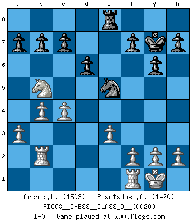 Last move : 1-0 2013 December 22 4:2:19 [Event "FICGS__CHESS__CLASS_D__000200"] [Site "FICGS"] [Date "2013.11.20"] [Round "1"] [White "Archip,Laurentiu"] [Black "Piantadosi,Angelo"] [Result "1-0"] [WhiteElo "1503"] [BlackElo "1420"] 1.c4 e5 2.d4 exd4 3.Qxd4 Nc6 4.Qd1 d6 5.Nf3 Bg4 6.Nc3 Nf6 7.a3 Be7 8.e3 O-O 9.Be2 Re8 10.O-O Bf8 11.b4 g6 12.Bb2 Bg7 13.Rb1 Ne4 14.Nxe4 Rxe4 15.Bxg7 Kxg7 16.Nd2 Bxe2 17.Qxe2 Qf6 18.Nxe4 Qe5 19.Qb2 Qxb2 20.Rxb2 Re8 21.Nc3 Ne5 22.Nb5 1-0 English Opening Kingside Castling by player Black (move 8) Kingside Castling by player White (move 10) Player White won this chess game. Follow this game move after move (download)There's never before been a Chess player with such a thorough knowledge of the intricacies of the game and such an absolutely indomitable will to win. I think Bobby is the greatest player that ever lived. (Lisa Lane) Im Fernschach kannst du während dem Spiel rauchen. (John Christen Knudsen) El Jaque al descubierto es el bombardero del tablero. (Reuben Fine) Un footballeur joue avec ses pieds, parfois avec sa tête. Un joueur d'échecs ne joue qu'avec sa tête. Et quand il ne joue plus, il meurt. (Jacob Murray) All battles are fought by scared men who'd rather be someplace else. (John Wayne in the movie In harm's way)