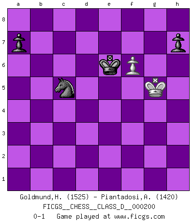 Last move : 0-1 2014 April 10 21:46:9 [Event "FICGS__CHESS__CLASS_D__000200"] [Site "FICGS"] [Date "2013.11.20"] [Round "1"] [White "Goldmund,Heike"] [Black "Piantadosi,Angelo"] [Result "0-1"] [WhiteElo "1525"] [BlackElo "1420"] 1.b4 e5 2.Bb2 d6 3.e3 f5 4.c4 Nf6 5.d3 Be7 6.Nf3 Nbd7 7.Be2 O-O 8.O-O c6 9.Nc3 d5 10.a3 dxc4 11.dxc4 Ne8 12.b5 Nc5 13.Nxe5 Qxd1 14.Rfxd1 Bf6 15.Nd3 Nxd3 16.Bxd3 Be6 17.e4 fxe4 18.Nxe4 Bxb2 19.Ra2 Be5 20.Ng5 Bf5 21.Bxf5 Rxf5 22.Ne6 Kf7 23.Nc5 Bxh2+ 24.Kxh2 Rxc5 25.Rd7+ Ke6 26.Rxb7 cxb5 27.cxb5 Rc7 28.Re2+ Kd7 29.Rxc7+ Nxc7 30.a4 Re8 31.Rd2+ Kc8 32.f3 Re7 33.Rc2 Kb7 34.Rc5 Rd7 35.a5 Rd5 36.a6+ Kb8 37.Rxd5 Nxd5 38.g4 Nc3 39.f4 Nxb5 40.Kg3 Kc7 41.f5 Kd6 42.Kf4 Nc7 43.g5 Nxa6 44.f6 gxf6 45.gxf6 Ke6 46.Kg5 Nc5 0-1 Polish (Sokolsky) opening Kingside Castling by player Black (move 7) Kingside Castling by player White (move 8) 10 pieces endgame at move 37 : White KPPPP , Black KNPPP WHITE : King + 4 Pawns BLACK : King + 1 Knight 3 Pawns 9 pieces endgame at move 39 : White KPPP , Black KNPPP WHITE : King + 3 Pawns BLACK : King + 1 Knight 3 Pawns 8 pieces endgame at move 43 : White KPP , Black KNPPP WHITE : King + 2 Pawns BLACK : King + 1 Knight 3 Pawns 7 pieces endgame at move 44 : White KP , Black KNPPP WHITE : King + 1 Pawn BLACK : King + 1 Knight 3 Pawns 6 pieces endgame at move 45 : White KP , Black KNPP WHITE : King + 1 Pawn BLACK : King + 1 Knight 2 Pawns Player Black won this chess game. Follow this game move after move (download)Every Pawn is a potential Queen. (James Mason) Zu meiner Zeit war ein 20 jähriger ein junger Spieler, heute ist er ein Veteran. (Garry Kasparov) La caracteristica mas importante en la posición del Ajedrez es la actividad de las piezas. Esto es absolutamente fundamental en todas las fases del juego: Apertura, Juego Medio y especialmente Finales. La limitación primordial en la actividad de una pieza, es la estructuración de los Peones. (Michael Stean) Je fais ceci parce que dans cinquante coups j'obtiendrai cela; je m'appelle Mikhail Moisevitch Botvinnik. (Botvinnik) For to win one hundred victories in one hundred battles is not the acme of skill. To subdue the enemy without fighting is the acme of skill. (Sun Tzu)