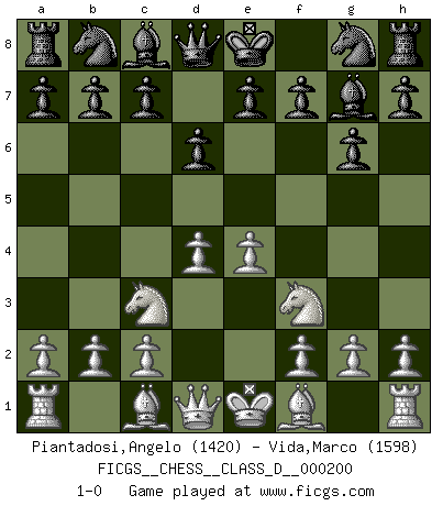 Last move : 1-0 2014 January 3 10:17:33 [Event "FICGS__CHESS__CLASS_D__000200"] [Site "FICGS"] [Date "2013.11.20"] [Round "1"] [White "Piantadosi,Angelo"] [Black "Vida,Marco"] [Result "1-0"] [WhiteElo "1420"] [BlackElo "1598"] 1.e4 d6 2.d4 g6 3.Nf3 Bg7 4.Nc3 1-0 This chess game has been lost on time (started : 2013.11.20 8:24:0) King's pawn Opening Player White won this chess game. Follow this game move after move (download)If your opponent offers you a draw, try to work out why he thinks he's worse off. (Nigel Short) Wie, soll nun auch die Opposition abgeschafft werden? Ja, es tut mir leid, Ihnen diesen Schmerz nicht ersparen zu können. (Aaron Nimzowitsch) Debes de llevar a tu oponente hacia un profundo y obscuro bosque donde 2+2=5, y el camino que conduce a la salida es suficientemente ancho para solamente uno. (Mikhail Tal) A chaque perte on perd un peu de soi. (Joël Lautier) I don't diet. I just don't eat as much as I'd like to. (Linda Evangelista, supermodel)