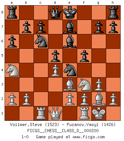 Last move : 1-0 2014 February 2 0:14:9 [Event "FICGS__CHESS__CLASS_D__000200"] [Site "FICGS"] [Date "2013.11.20"] [Round "1"] [White "Vollmer,Steve"] [Black "Puzanov,Vasyl"] [Result "1-0"] [WhiteElo "1523"] [BlackElo "1426"] 1.d4 f5 2.c4 Nf6 3.Nc3 e6 4.Nf3 d5 5.cxd5 exd5 6.g3 Nc6 7.Bg2 Be6 8.O-O Ne4 9.Be3 Be7 10.Rc1 a6 11.Na4 1-0 Dutch with c4 & Nc3 Kingside Castling by player White (move 8) Player White won this chess game. Follow this game move after move (download)No one ever won a game by resigning. (Unknown) Frage: Wie viele Autos haben Sie schon zerstört? - Antwort: Nur zwei. (Loek van Wely) Los problemas de Ajedrez exigen del compositor las mismas virtudes que caracterizan todo el arte de valor: originalidad, invención, concisión, armonía, complejidad e insinceridad explendida. (Vladimir Nabokov) Ce n'est pas pour s'amuser qu'il joue aux échecs : il célèbre un culte. (Vladimir Nabokov) Life is like a ten-speed bicycle: most of us have gears we never use. (Charles M. Schulz)