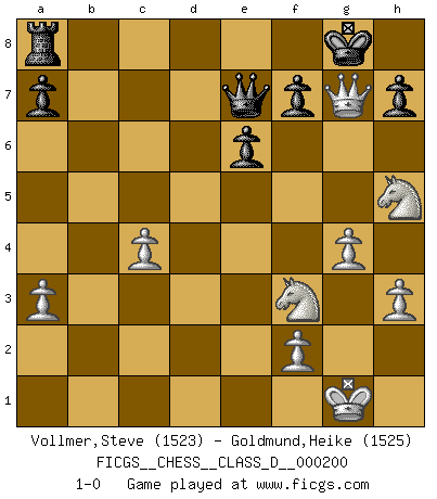Last move : 1-0 2014 January 18 15:50:56 [Event "FICGS__CHESS__CLASS_D__000200"] [Site "FICGS"] [Date "2013.11.20"] [Round "1"] [White "Vollmer,Steve"] [Black "Goldmund,Heike"] [Result "1-0"] [WhiteElo "1523"] [BlackElo "1525"] 1.e4 d5 2.exd5 Qxd5 3.Nf3 Nf6 4.d4 Bg4 5.Be2 e6 6.O-O Be7 7.c4 Qd8 8.Nc3 Nbd7 9.Be3 O-O 10.a3 c6 11.b4 b6 12.Qc2 Qc7 13.Nd2 Bxe2 14.Nxe2 Ng4 15.Bf4 Bd6 16.Bxd6 Qxd6 17.Nf3 c5 18.bxc5 bxc5 19.Rfd1 Ndf6 20.h3 Nh6 21.g4 cxd4 22.Rxd4 Qc5 23.Qd3 g5 24.Rb1 Qc7 25.Rb5 Kh8 26.Ng3 Rfd8 27.Rxg5 Rxd4 28.Qxd4 Qe7 29.Nh5 Nhg8 30.Rxg8+ Kxg8 31.Nxf6+ Kg7 32.Nh5+ Kg8 33.Qg7+ 1-0 Scandinavian (centre counter) defense Kingside Castling by player White (move 6) Kingside Castling by player Black (move 9) Player White won this chess game. Follow this game move after move (download)Human affairs are like a Chess game: only those who do not take it seriously can be called good players. (Hung Tzu Ch'eng) Kombinieren und Schwarzhandel gehören verboten. (Savielly Grigorievitsch Tartakower) Si tu oponente no puede hacer nada activo, entonces no apures la posición; En vez de eso, dejalo estar sentado ahí, sufriendo y rogandote por un empate. (Jeremy Silman) Les pièces de l'échiquier étaient impitoyables. Elles le retenaient, elles l'absorbaient. Il y avait de l'horreur en cela, mais aussi une harmonie unique. Car, qu'y a-t-il dans le monde, à part les échecs ? (V. Nabokov) Excelling at chess has long been considered a symbol of more general intelligence. That is an incorrect assumption in my view, as pleasant as it might be. But for the purposes of argument and investigation, chess is, in Russkin-Gutman's words, 'an unparalleled laboratory, since both the learning process and the degree of ability obtained can be objectified and quantified, providing an excellent comparative framework on which to use rigorous analytical techniques.' (The Chess Master and the Computer, by Garry Kasparov - 2010)