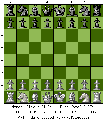Last move : 0-1 2013 December 31 22:11:40 [Event "FICGS__CHESS__UNRATED_TOURNAMENT__000035"] [Site "FICGS"] [Date "2013.11.21"] [Round "1"] [White "Marcel,Alexis"] [Black "Riha,Josef"] [Result "0-1"] [WhiteElo "1164"] [BlackElo "1974"] 0-1 This chess game has been lost on time (started : 2013.11.21 12:26:9) Player Black won this chess game. Follow this game move after move (download)Nonsense was the last thing Fischer was interested in, as far as Chess was concerned. (Elie Agur) Dein Körper muss in Topform sein. Dein Schach verfällt, wenn dein Körper verfällt. Der Körper kann nicht vom Geist getrennt werden. (Robert James Fischer) Botvinnik trató de alejar el misterio referente al Ajedrez, siempre relacionandolo a situaciones de la vida diaria. Solía llamar al Ajedrez un problema inexacto típico, similar a aquellos en que la gente tiene siempre que resolver a cada día. (Garry Kasparov) Un journaliste : 'Vous préférez avoir une dame de plus sur l'échiquier ou au lit ?' Boris Spassky : 'Ca dépend de la position.' My poor ole parrot... Is not in the circulation of displays ....poo hoo hoo :) (Wayne Lowrance's enigma)
