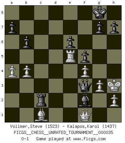 Last move : 0-1 2014 January 12 22:27:59 [Event "FICGS__CHESS__UNRATED_TOURNAMENT__000035"] [Site "FICGS"] [Date "2013.11.21"] [Round "1"] [White "Vollmer,Steve"] [Black "Kalapos,Karol"] [Result "0-1"] [WhiteElo "1523"] [BlackElo "1437"] 1.d4 d5 2.c4 c6 3.Nf3 e6 4.g3 Nf6 5.Bg2 Nbd7 6.b3 Bb4+ 7.Bd2 Be7 8.O-O O-O 9.Nc3 b6 10.Qc2 Ba6 11.Ne5 Nxe5 12.dxe5 Ng4 13.cxd5 cxd5 14.Qb2 d4 15.Ne4 Nxe5 16.f4 Ng4 17.Rfe1 Rc8 18.b4 Qd7 19.a4 f5 20.Nf2 Nxf2 21.Kxf2 Bf6 22.Rac1 Rxc1 23.Bxc1 d3 24.Qd2 Rc8 25.exd3 Bxd3 26.Kg1 Rc2 27.Qd1 Bd4+ 28.Kh1 Bf2 29.Re5 Be4 30.Qf1 Bxg2+ 31.Kxg2 Qb7+ 32.Kh3 Qf3 0-1 QGD Slav : 3.Nf3 Kingside Castling by player White (move 8) Kingside Castling by player Black (move 8) Player Black won this chess game. Follow this game move after move (download)Man is a frivolous, a specious creature, and like a Chess player, cares more for the process of attaining his goal than for the goal itself. (Dostoyevsky) Es ist schade, dass viele Schachsportler vergessen, wie wichtig Auftreten und angemessene Kleidung sind. (Alexandra Kosteniuk) El sobresalir en el Ajedrez es un signo de una mente intrigante. (Sir Arthur Conan Doyle) On a dit que l'homme se distingue de l'animal par le fait qu'il achète plus de livres qu'il ne peut en lire. Je voudrais suggérer qu'inclure à la liste des livres quelques livres d'échecs rendrait la distinction manifeste. (Edward Lasker) Always remember that you are unique; just like everyone else. (Unknown)