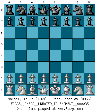 Last move : 0-1 2013 December 31 22:11:40 [Event "FICGS__CHESS__UNRATED_TOURNAMENT__000035"] [Site "FICGS"] [Date "2013.11.21"] [Round "1"] [White "Marcel,Alexis"] [Black "Pech,Jaroslav"] [Result "0-1"] [WhiteElo "1164"] [BlackElo "0965"] 0-1 This chess game has been lost on time (started : 2013.11.21 12:26:9) Player Black won this chess game. Follow this game move after move (download)You sit at the board and suddenly your heart leaps. Your hand trembles to pick up the piece and move it. But what Chess teaches you is that you must sit there calmly and think about whether it's really a good idea and whether there are other better ideas. (Stanley Kubrick) Nur ein wirklich starker Spieler weiß wie schwach er spielt. (Savielly Grigorievitsch Tartakower) El Ajedrez es parte de la cultura, y si una cultura esta en decadencia, entonces también el Ajedrez declinará. (Mikhail Botvinnik) Je ne suis pas le dernier à jouer lâchement des coups douteux pendant le zeïtnot de l'adversaire pour l'achever: en effet les coups qui font le plus peur sont ceux que l'on ne comprend pas. Je me fais souvent peur quand je joue. (Un professeur anonyme) The difference between stupidity and genius is that genius has its limits. (Murphy)