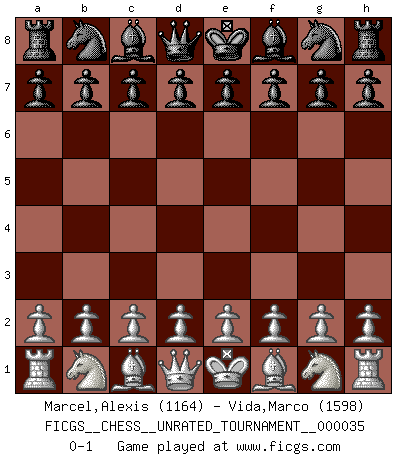 Last move : 0-1 2013 December 31 22:11:40 [Event "FICGS__CHESS__UNRATED_TOURNAMENT__000035"] [Site "FICGS"] [Date "2013.11.21"] [Round "1"] [White "Marcel,Alexis"] [Black "Vida,Marco"] [Result "0-1"] [WhiteElo "1164"] [BlackElo "1598"] 0-1 This chess game has been lost on time (started : 2013.11.21 12:26:9) Player Black won this chess game. Follow this game move after move (download)The isolated Pawn casts gloom over the entire chessboard. (Aaron Nimzovich) Spielt Blackmar-Diemer-Gambit, und das Matt kommt von selbst! (Emil Joseph Diemer) Solo los afeminados hacen el Enroque. (Rob Sillars) Le plus grand jeu de l'esprit jamais inventé, plus vous l'apprenez, plus vous y prenez du plaisir. (Garry Kasparov) Life is pleasant. Death is peaceful. It's the transition that's troublesome. (Isaac Asimov)
