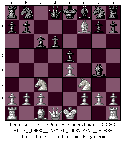 Last move : 1-0 2014 February 23 13:38:32 [Event "FICGS__CHESS__UNRATED_TOURNAMENT__000035"] [Site "FICGS"] [Date "2013.11.21"] [Round "1"] [White "Pech,Jaroslav"] [Black "Snaden,Ladane"] [Result "1-0"] [WhiteElo "0965"] [BlackElo "1500"] 1.d4 d6 2.e4 f6 3.Nc3 e5 4.Nf3 c6 5.Bc4 Bg4 6.dxe5 fxe5 7.Bf7+ 1-0 This chess game has been lost on time (started : 2013.11.21 12:26:9) Queen's Pawn Player White won this chess game. Follow this game move after move (download)Fischer sacrificed virtually everything most of us weakies (to use his term) value, respect, and cherish, for the sake of an artful, often beautiful board game, for the ambivalent privilege of being its greatest master. (Paul Kollar) Ich las kürzlich ein Buch von Nietzsche. Er sagte Religion verdumme nur die Menschen. Ich stimme zu. (Robert James Fischer) Nos gusta pensar. (Gary Kasparov) Les échecs sont utiles à l'exercice de la faculté de penser et à celle de l'imagination. Car nous devons posséder une méthode élaborée pour atteindre des buts partout où nous devons conduire notre raison. (Leibnitz) Hold em is to stud what chess is to checkers. (Johnny Moss)