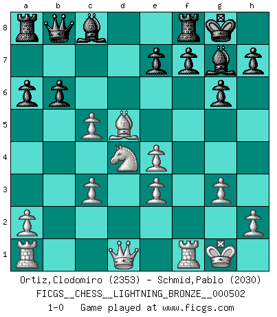 Last move : 1-0 2013 November 21 22:30:26 [Event "FICGS__CHESS__LIGHTNING_BRONZE__000502"] [Site "FICGS"] [Date "2013.11.21"] [Round "1"] [White "Ortiz,Clodomiro"] [Black "Schmid,Pablo"] [Result "1-0"] [WhiteElo "2353"] [BlackElo "2030"] 1.d4 Nf6 2.c4 g6 3.Nc3 d5 4.cxd5 Nxd5 5.e4 Nxc3 6.bxc3 c5 7.Bc4 Bg7 8.Ne2 Nc6 9.Be3 O-O 10.O-O b6 11.dxc5 Qc7 12.Nd4 Ne5 13.Nb5 Qb8 14.Bd5 Ng4 15.g3 Nxe3 16.fxe3 a6 17.Nd4 1-0 This chess game has been lost on time (started : 2013.11.21 21:46:36) King's Indian defense, 3.Nc3 Kingside Castling by player Black (move 9) Kingside Castling by player White (move 10) Player White won this chess game. Follow this game move after move (download)A good player is always lucky. (Jose Raul Capablanca) Eine Person mit durchschnittlichem IQ kann etwa eine ELO von 2000 erreichen. (Jonathan Levitt) En el Ajedrez, tal como es jugado por los Maestros, practicamente la suerte es eliminada. (Emanuel Lasker) Le pion, dans sa simplicité, marche droit devant lui, mais lorsqu'il prend, il le fait obliquement? Ainsi l'homme, tant qu'il reste pauvre, marche dans la droiture et vit honnêtement, mais lorsqu'il recherche les honneurs, il flatte, se parjure et, par les voies obliques, cherche une position supérieure sur l'échiquier du monde. (Jean de Galles) Good decisions come from experience, and experience comes from bad decisions. (Anonymous)