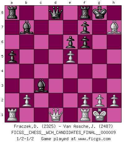 Last move : 1/2-1/2 2014 March 12 19:21:49 [Event "FICGS__CHESS__WCH_CANDIDATES_FINAL__000009"] [Site "FICGS"] [Date "2013.11.22"] [Round "2"] [White "Fraczek,Dariusz"] [Black "Van Assche,Jeroen"] [Result "1/2-1/2"] [WhiteElo "2325"] [BlackElo "2487"] 1.d4 Nf6 2.c4 e6 3.Nc3 Bb4 4.e3 O-O 5.Bd3 d5 6.Nf3 c5 7.O-O dxc4 8.Bxc4 cxd4 9.exd4 a6 10.Bd3 b5 11.a4 bxa4 12.Qxa4 a5 13.Bg5 Nbd7 14.Ne5 Bb7 15.Qd1 Nxe5 16.dxe5 Bxc3 17.Bxf6 gxf6 18.Bxh7+ 1/2-1/2 Nimzo-Indian : 4.e3 O-O, 5.Bd3 d5 Kingside Castling by player Black (move 4) Kingside Castling by player White (move 7) This chess game ended in a draw. Follow this game move after move (download)The boy (then a 12 year old boy named Anatoly Karpov) doesn't have a clue about Chess, and there's no future at all for him in this profession. (Mikhail Botvinnik) Es gibt Leute, die glauben, alles wäre vernünftig, was man mit einem ernsthaften Gesicht tut. (Georg Christoph Lichtenberg) El sobresalir en el Ajedrez es un signo de una mente intrigante. (Sir Arthur Conan Doyle) Vous savez, camarade Pachman, je n'éprouve pas de plaisir à être ministre, je jouerais plutôt aux échecs comme vous, ou alors ferais une révolution au Venezuela. (Che Guevara à Ludek Pachman, 'Checkmate in Prague', 1975) Looking at the proliferation of personal web pages on the Net, it looks like very soon everyone on Earth will have 15 megabytes of fame. (M.G. Sriram)