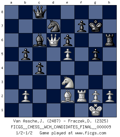 Last move : 1/2-1/2 2014 March 17 17:28:3 [Event "FICGS__CHESS__WCH_CANDIDATES_FINAL__000009"] [Site "FICGS"] [Date "2013.11.22"] [Round "3"] [White "Van Assche,Jeroen"] [Black "Fraczek,Dariusz"] [Result "1/2-1/2"] [WhiteElo "2487"] [BlackElo "2325"] 1.d4 d5 2.c4 c6 3.Nf3 Nf6 4.Nc3 e6 5.Bg5 h6 6.Bh4 dxc4 7.e4 g5 8.Bg3 b5 9.Be2 Bb7 10.O-O Nbd7 11.Ne5 Bg7 12.Nxd7 Nxd7 13.Bd6 a6 14.a4 Bf8 15.Bxf8 Kxf8 16.e5 Kg7 17.f4 c5 18.axb5 axb5 19.Rxa8 Qxa8 20.Rf2 cxd4 21.Qxd4 Bc6 22.fxg5 hxg5 23.Qd6 Rh6 24.Nd1 Qc8 25.Ne3 1/2-1/2 QGD Slav : 4.Nc3 Kingside Castling by player White (move 10) This chess game ended in a draw. Follow this game move after move (download)When you play Bobby, it is not a question if you win or lose. It is a question if you survive. (Boris Spassky) Wenn Capablanka heute auf der Schachbühne erscheinen würde, hätte er ein halbes Jahr gebraucht um sich die Schachtheorie anzueignen. Und dann hätte er alles und jeden besiegt. (Mikhail Moiseyevich Botvinik) Es el objetivo de la escuela moderna no tratar cada posición de acuerdo a una regla general, sino de acuerdo al principio inherente en la posición. (Richard Reti) Il (Jacob Murray) ne joue pas pour le bon coup, mais pour le meilleur. (Eloi Relange) Two beer, or not two beer. (Unknown)