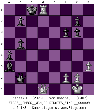 Last move : 1/2-1/2 2014 May 20 20:18:27 [Event "FICGS__CHESS__WCH_CANDIDATES_FINAL__000009"] [Site "FICGS"] [Date "2013.11.22"] [Round "4"] [White "Fraczek,Dariusz"] [Black "Van Assche,Jeroen"] [Result "1/2-1/2"] [WhiteElo "2325"] [BlackElo "2487"] 1.Nf3 d5 2.c4 d4 3.b4 f6 4.e3 e5 5.c5 a5 6.Qa4+ Bd7 7.b5 Bxc5 8.Bc4 Ne7 9.exd4 exd4 10.Ba3 Na6 11.O-O Nb4 12.d3 Bf5 13.Qb3 Qd6 14.Nbd2 O-O-O 15.Nh4 Bg6 16.Nxg6 hxg6 17.h3 Ned5 18.Ne4 Qe5 19.Rae1 Nb6 20.Bb2 Bf8 21.Ng3 a4 22.Qd1 Qc5 23.a3 Nxc4 24.dxc4 Rh4 25.axb4 Qxb4 26.Bc1 Qxc4 27.b6 cxb6 28.Bd2 d3 29.Qb1 Qc6 30.Re3 Rhd4 31.Rc1 Rc4 32.Rxc4 Qxc4 33.Re1 Qc6 34.Ne4 Rd4 35.Rc1 Rc4 36.Nc3 Ba3 37.Rd1 Rxc3 38.Bxc3 Qxc3 39.Rxd3 Qb2 40.Qd1 b5 41.Rd8+ 1/2-1/2 Reti : Advance variation Kingside Castling by player White (move 11) Queenside Castling by player Black (move 14) This chess game ended in a draw. Follow this game move after move (download)Could we look into the head of a Chess player, we should see there a whole world of feelings, images, ideas, emotion and passion. (Alfred Binet) Es hat in meinem Leben Zeiten gegeben, in denen das Schachspiel, wenn nicht zum Lebenszweck, so doch zu einem regelrechten Lebensersatz geworden ist. Man fühlt sich in solchen Zeiten nicht so, als besäße man eine göttliche Gabe, sondern eher so, als sei man von ihr besessen. (Garry Kasparov) Una victoria por una combinación errónea, aunque sea espectacular, me llena de horror artístico. (Wilhelm Steinitz) Si rien de grave n'est détecté lors de l'analyse d'une position, on joue alors le coup. Seconde règle de Blumenfeld. Have no fear of perfection - you'll never reach it. (Salvador Dali)