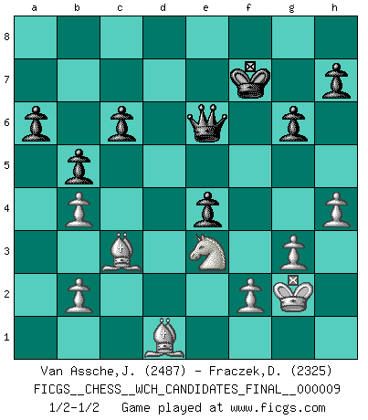 Last move : 1/2-1/2 2014 April 26 12:8:1 [Event "FICGS__CHESS__WCH_CANDIDATES_FINAL__000009"] [Site "FICGS"] [Date "2013.11.22"] [Round "7"] [White "Van Assche,Jeroen"] [Black "Fraczek,Dariusz"] [Result "1/2-1/2"] [WhiteElo "2487"] [BlackElo "2325"] 1.d4 Nf6 2.c4 g6 3.Nc3 d5 4.Nf3 Bg7 5.Qb3 dxc4 6.Qxc4 O-O 7.e4 a6 8.Be2 b5 9.Qb3 Nc6 10.e5 Be6 11.exf6 Bxb3 12.fxg7 Kxg7 13.axb3 Nxd4 14.Nxd4 Qxd4 15.O-O Qd6 16.Be3 Rad8 17.Ne4 Qe5 18.Nc5 f5 19.Nd3 Qe4 20.Rad1 f4 21.Bf3 Qf5 22.Nxf4 Rxd1 23.Rxd1 e5 24.Nd5 e4 25.Bd4+ Kf7 26.Ne3 Qf4 27.Be2 Rd8 28.g3 Qg5 29.b4 c6 30.h4 Qe7 31.Bc3 Rxd1+ 32.Bxd1 Qe6 33.Kg2 1/2-1/2 King's Indian defense, 3.Nc3 Kingside Castling by player Black (move 6) Kingside Castling by player White (move 15) This chess game ended in a draw. Follow this game move after move (download)What would Chess be without silly mistakes ? (Kurt Richter) Ich würde die 30 stärksten Spieler der USA im Simultanspiel besiegen. (José Raúl Capablanca) Combinaciones deslumbrantes son para la mayoría, mover madera es para los pocos. (Georg Kieninger) Le joueur d'Echecs qui veut atteindre le top est obligé de développer son propre credo créatif. Alexeï Stepanovicth Souétine. Il est facile d'écrire des livres ! Ce qui est difficile, c'est de jouer ! (Alexeï Stepanovicth Souétine) SEO proverb : Make your website optimized for human beings, not for search engines.