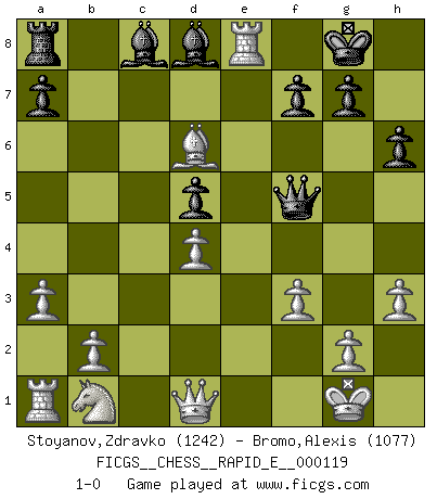 Last move : 1-0 2013 December 3 20:58:48 [Event "FICGS__CHESS__RAPID_E__000119"] [Site "FICGS"] [Date "2013.11.23"] [Round "1"] [White "Stoyanov,Zdravko"] [Black "Bromo,Alexis"] [Result "1-0"] [WhiteElo "1242"] [BlackElo "1077"] 1.e4 e5 2.Nf3 Nc6 3.Bb5 d6 4.Bxc6+ bxc6 5.h3 h6 6.d3 Nf6 7.a3 Be7 8.O-O c5 9.Be3 c6 10.c3 d5 11.Nxe5 Qd6 12.Bf4 Qe6 13.exd5 cxd5 14.d4 cxd4 15.cxd4 Ne4 16.f3 Nd6 17.Re1 Qf5 18.Bg3 O-O 19.Nc6 Bf6 20.Bxd6 Rd8 21.Nxd8 Bxd8 22.Re8+ 1-0 Ruy Lopez : Old Steinitz defense Kingside Castling by player White (move 8) Kingside Castling by player Black (move 18) Player White won this chess game. Follow this game move after move (download)All that matters on the Chessboard is good moves. (Bobby Fischer) Viele Opfer benötigen überhaupt keine konkrete Berechnung. Es genügt sich die entstehende Position kurz vorzustellen, um uns davon zu überzeugen, dass das Opfer korrekt ist. (Mikhail Nekhemyevich Tal) El Ajedrez es un juego de pelea el cual es puramente intelectual e incluye la suerte. (Richard Reti) Il n'y a pas eu de défaite parce que je ne crois pas que cet ordinateur ait jamais existé. IBM a triché en refusant d'imprimer les modes de recherche de la machine. C'est évident, pendant le match, des coups décisifs ont été joués par des êtres humains. Aujourd'hui, les meilleurs spécialistes en informatique ne peuvent toujours pas expliquer comment Deep-Blue a pu jouer contre la logique des ordinateurs. IBM a gagné une guerre de communication, mais ils sont incapables de prouver que l'ordinateur a gagné tout seul. (Garry Kasparov) If you are good, you will be assigned all the work. If you are really good, you will get out of it. (Dan Rotaru)