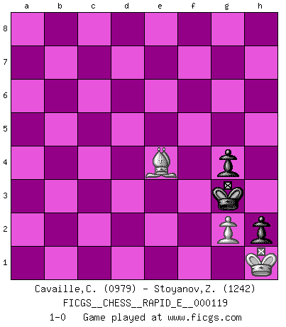 Last move : 1-0 2013 December 3 16:57:9 [Event "FICGS__CHESS__RAPID_E__000119"] [Site "FICGS"] [Date "2013.11.23"] [Round "1"] [White "Cavaille,Cedric"] [Black "Stoyanov,Zdravko"] [Result "1-0"] [WhiteElo "0979"] [BlackElo "1242"] 1.e4 c5 2.Nf3 a6 3.Nc3 e6 4.d4 cxd4 5.Nxd4 Qf6 6.Be3 Bc5 7.Qf3 Qxf3 8.Nxf3 Bxe3 9.fxe3 Ne7 10.O-O-O h6 11.Be2 O-O 12.Ne5 Nec6 13.Nxc6 Nxc6 14.Na4 b5 15.Nc5 Kh7 16.Nxd7 Rd8 17.Nc5 Ra7 18.Rxd8 Nxd8 19.b4 Rc7 20.Rd1 Nc6 21.a3 Bb7 22.Nxb7 Rxb7 23.c4 bxc4 24.Bxc4 Ne5 25.Bxa6 Rc7+ 26.Kb2 Ng4 27.Rc1 Rxc1 28.Kxc1 Nxe3 29.b5 Nc4 30.a4 f5 31.a5 Nxa5 32.exf5 exf5 33.b6 Nb3+ 34.Kc2 Nc5 35.Bc8 Kg6 36.b7 Nxb7 37.Bxb7 Kg5 38.Bf3 Kh4 39.Kd3 g5 40.h3 Kg3 41.Ke3 g4 42.hxg4 fxg4 43.Be4 h5 44.Ke2 h4 45.Kf1 h3 46.Kg1 h2+ 47.Kh1 1-0 Sicilian : O'Kelly variation Queenside Castling by player White (move 10) Kingside Castling by player Black (move 11) 10 pieces endgame at move 32 : White KBPPP , Black KNPPP WHITE : King + 1 Bishop 3 Pawns BLACK : King + 1 Knight 3 Pawns 9 pieces endgame at move 36 : White KBPP , Black KNPPP WHITE : King + 1 Bishop 2 Pawns BLACK : King + 1 Knight 3 Pawns 8 pieces endgame at move 37 : White KBPP , Black KPPP WHITE : King + 1 Bishop 2 Pawns BLACK : King + 3 Pawns 7 pieces endgame at move 42 : White KBPP , Black KPP WHITE : King + 1 Bishop 2 Pawns BLACK : King + 2 Pawns 6 pieces endgame at move 42 : White KBP , Black KPP WHITE : King + 1 Bishop 1 Pawn BLACK : King + 2 Pawns Player White won this chess game. Follow this game move after move (download)My style is somewhere between that of Tal and Petrosian. (Reshevsky) Alle Schachspieler sollten auch ein Hobby haben. (Savielly Grigorievitsch Tartakower) El hombre es un frívolo, una creatura engañosa y como un jugador de Ajedrez, se preocupa mas por el proceso de obtener su meta que de la meta por sí misma. (Dostoyevsky) Mon pion favori sur ma case favorite ! Bronstein en parlant d'un coup de pion en h5 quand il avait les Noirs. Art is the only way to run away without leaving home. (Twyla Tharp)