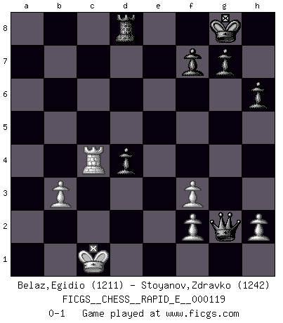 Last move : 0-1 2013 December 17 21:19:46 [Event "FICGS__CHESS__RAPID_E__000119"] [Site "FICGS"] [Date "2013.11.23"] [Round "1"] [White "Belaz,Egidio"] [Black "Stoyanov,Zdravko"] [Result "0-1"] [WhiteElo "1211"] [BlackElo "1242"] 1.e4 c5 2.Bc4 e6 3.Nf3 a6 4.O-O h6 5.a4 b6 6.b3 Nc6 7.Be2 Bb7 8.Nc3 Be7 9.d3 Nf6 10.Re1 O-O 11.Bb2 b5 12.axb5 axb5 13.Rxa8 Qxa8 14.Nxb5 Rc8 15.Nd2 Ba6 16.Nc3 Nd4 17.Na4 Rb8 18.Nc4 Bxc4 19.dxc4 Qxe4 20.Nxc5 Bxc5 21.Bf3 Nxf3+ 22.gxf3 Qg6+ 23.Kf1 d6 24.Bd4 Bb4 25.Re2 d5 26.cxd5 Nxd5 27.c3 Bxc3 28.Rc2 Nf4 29.Rxc3 Qg2+ 30.Ke1 Rd8 31.Rc4 e5 32.Qc1 Nd3+ 33.Kd2 Nxc1 34.Kxc1 exd4 0-1 Sicilian defense Kingside Castling by player White (move 4) Kingside Castling by player Black (move 10) Player Black won this chess game. Follow this game move after move (download)Chess is no whit inferior to the violin, and we have a large number of professional violinists. (Mikhail Botvinnik) Gewöhnliche Menschen denken nur daran, wie sie ihre Zeit verbringen. Ein intelligenter Mensch versucht, sie auszunutzen. (Arthur Schopenhauer) Ayuda a tus piezas para que ellas te puedan ayudar. (Paul Morphy) Le thème de l'attaque double intervient d'une manière ou d'une autre dans l'immense majorité des combinaisons. (Youri Averbakh) The beginning is the most important part of the work. (Plato)