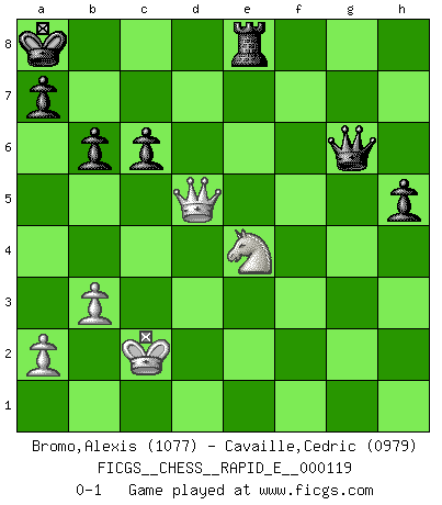 Last move : 0-1 2013 November 28 21:56:8 [Event "FICGS__CHESS__RAPID_E__000119"] [Site "FICGS"] [Date "2013.11.23"] [Round "1"] [White "Bromo,Alexis"] [Black "Cavaille,Cedric"] [Result "0-1"] [WhiteElo "1077"] [BlackElo "0979"] 1.d4 d5 2.c4 dxc4 3.Nc3 Qd7 4.e4 e5 5.Nf3 exd4 6.Nxd4 Bc5 7.Be3 Nc6 8.Bxc4 Nxd4 9.Bxd4 Qxd4 10.Bxf7+ Kxf7 11.Qf3+ Qf6 12.Qh5+ g6 13.Qxc5 c6 14.Rd1 Be6 15.b3 Nh6 16.h3 Rhd8 17.Rxd8 Qxd8 18.Ke2 Qd7 19.Rd1 Qe7 20.Qe3 Kg7 21.f4 b6 22.g4 Kf7 23.f5 Nxg4 24.hxg4 gxf5 25.gxf5 Bd7 26.Rf1 Rg8 27.e5 Ke8 28.f6 Qf7 29.Ne4 Kd8 30.Rd1 Qh5+ 31.Ke1 Qh1+ 32.Kd2 Qh2+ 33.Kc3 Qxe5+ 34.Kb4 Qb5+ 35.Ka3 Qa5+ 36.Kb2 Qe5+ 37.Kb1 Kc7 38.f7 Rf8 39.Rf1 Bf5 40.Rxf5 Qxf5 41.Qg3+ Kb7 42.Qd3 Ka8 43.Kc2 Qxf7 44.Nd6 Qg6 45.Ne4 h5 46.Qd5 Re8 0-1 Queen's gambit accepted Player Black won this chess game. Follow this game move after move (download)Chess is the gymnasium of the mind. (Blaise Pascal) Jeder Schachmeister war einmal ein Anfänger. (Irving Chernev) Nunca nadie ha ganado una partida de Ajedrez rindiendose. (Unknown) La solitude du joueur d'Echecs à l'approche du mat est semblable à celle du condamné. (Francis Szpiner) Life is pain my dear and anyone who says otherwise is selling something. (Princess Bride)