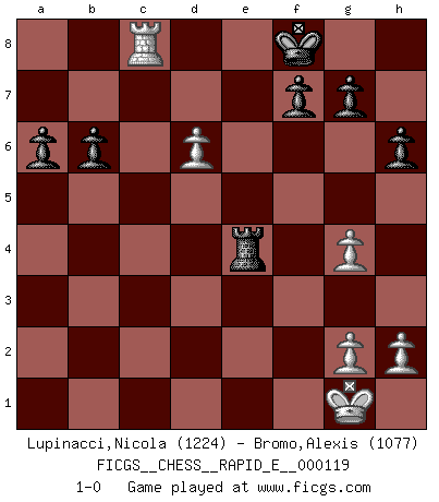 Last move : 1-0 2014 January 14 21:5:22 [Event "FICGS__CHESS__RAPID_E__000119"] [Site "FICGS"] [Date "2013.11.23"] [Round "1"] [White "Lupinacci,Nicola"] [Black "Bromo,Alexis"] [Result "1-0"] [WhiteElo "1224"] [BlackElo "1077"] 1.d4 d5 2.c4 e6 3.Nc3 Nf6 4.Bg5 h6 5.Bh4 Nc6 6.e3 a6 7.Nf3 Bb4 8.a3 Bxc3+ 9.bxc3 O-O 10.Bd3 Re8 11.O-O e5 12.dxe5 Nxe5 13.Nxe5 Rxe5 14.Bxf6 Qxf6 15.cxd5 Bd7 16.c4 Rd8 17.Qb3 b6 18.Rad1 Rg5 19.Kh1 Bh3 20.Be4 Re8 21.Bf3 Bg4 22.Bxg4 Rxg4 23.Qc2 R8e4 24.f3 Rxc4 25.fxg4 Qxf1+ 26.Rxf1 Rxc2 27.Kg1 Ra2 28.Rc1 Rxa3 29.e4 Re3 30.Rxc7 Rxe4 31.d6 Kf8 32.Rc8+ 1-0 QGD : 4.Bg5 Kingside Castling by player Black (move 9) Kingside Castling by player White (move 11) Player White won this chess game. Follow this game move after move (download)The Chess pieces are the block alphabet which shapes thoughts; and these thoughts, although making a visual design on the chessboard, express their beauty abstractly, like a poem. (Marcel Duchamp) Ich organisiere ein großes Turnier, was mich etwa 120000 Dollar kostet. Ich denke, das ist das erste Mal in der Schachgeschichte, daß ein Schachgroßmeister auch als Mäzen auftritt. (Miguel Najdorf) EL Ajedrez es como la vida. (Boris Spassky) Les échecs, c'est la lutte contre l'erreur. (Johannes Zukertort) Life is like a ten-speed bicycle: most of us have gears we never use. (Charles M. Schulz)