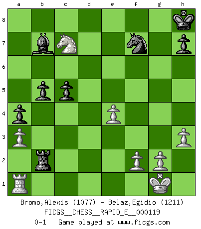 Last move : 0-1 2013 December 24 20:12:25 [Event "FICGS__CHESS__RAPID_E__000119"] [Site "FICGS"] [Date "2013.11.23"] [Round "1"] [White "Bromo,Alexis"] [Black "Belaz,Egidio"] [Result "0-1"] [WhiteElo "1077"] [BlackElo "1211"] 1.d4 d5 2.c4 dxc4 3.Nc3 Nf6 4.h3 e6 5.a3 Bd6 6.Nf3 O-O 7.e3 a5 8.Bxc4 c6 9.O-O b5 10.Bb3 a4 11.Ba2 Ba6 12.Re1 Nbd7 13.e4 e5 14.dxe5 Bxe5 15.Nxe5 Nxe5 16.Qxd8 Raxd8 17.Bg5 Nd3 18.Red1 c5 19.Nd5 Ne5 20.Bxf6 gxf6 21.Nxf6+ Kg7 22.Nh5+ Kh8 23.Rxd8 Rxd8 24.Bxf7 Nxf7 25.Nf4 Rd2 26.Nd5 Rxb2 27.Nc7 Bb7 0-1 Queen's gambit accepted Kingside Castling by player Black (move 6) Kingside Castling by player White (move 9) Player Black won this chess game. Follow this game move after move (download)Chess is thirty to forty percent psychology. You don't have this when you play a computer. I can't confuse it. (Judith Polgar) Das Schachspiel ist ein See, in welchem eine Mücke baden und ein Elefant ertrinken kann. (Emanuel Lasker) Observen a Garry Kasparov. Después de una derrota, invariablemente el gana la próxima partida. Prácticamente hace pedazos a su siguiente oponente. Eso es algo que tenemos que aprender a lograr. (Maurice Ashley) Pour moi, les échecs ne sont pas un jeu mais un art. (Alexandre Alekhine) A married woman is like a fish riding a bicycle. (Rodolfo d'Ettorre)