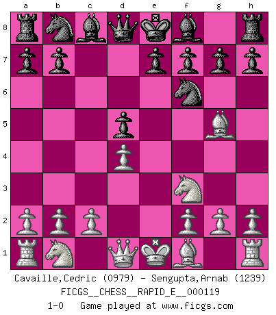 Last move : 1-0 2013 December 29 10:10:42 [Event "FICGS__CHESS__RAPID_E__000119"] [Site "FICGS"] [Date "2013.11.23"] [Round "1"] [White "Cavaille,Cedric"] [Black "Sengupta,Arnab"] [Result "1-0"] [WhiteElo "0979"] [BlackElo "1239"] 1.e4 c6 2.Nf3 d5 3.exd5 cxd5 4.d4 Nf6 5.Bg5 1-0 This chess game has been lost on time (started : 2013.11.23 17:44:58) Caro-Kann defense Player White won this chess game. Follow this game move after move (download)The only thing Chess players have in common is Chess. (Lodewijk Prins) Ich bin Weltmeister und muß mit niemandem irgend etwas diskutieren. (Viswanathan Anand) No existe un remordimiento como el remordimiento del Ajedrez. (H. G. Wells) Ce qui caractérise les parties de combat, c'est que si le défenseur a constamment de difficiles problèmes à résoudre, l'attaquant doit chercher sans relâche de nouvelles possibilités d'attaque. (Koblentz) The human is the only animal species whose members are able to talk themselves into difficulties that would not otherwise exist. (Wendell Johnson)